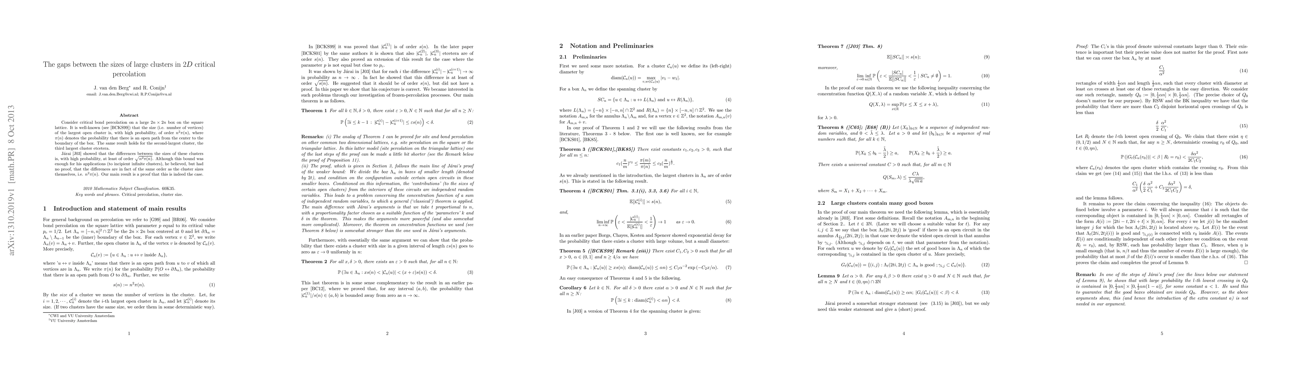 Consider critical bond percolation on a large 2n by 2n box on the square lattice. It is well-known that the size (i.e. number of vertices) of the largest open cluster is, with high probability, of order n^2 \pi(n), where \pi(n) denotes the probability that there is an open path from the center to the boundary of the box. The same result holds for the second-largest cluster, the third largest cluster etcetera. Jarai showed that the differences between the sizes of these clusters is, with high probability, at least of order \sqrt{n^2 \pi(n)}. Although this bound was enough for his applications (to incipient infinite clusters), he believed, but had no proof, that the differences are in fact of the same order as the cluster sizes themselves, i.e. n^2 \pi(n). Our main result is a proof that this is indeed the case.