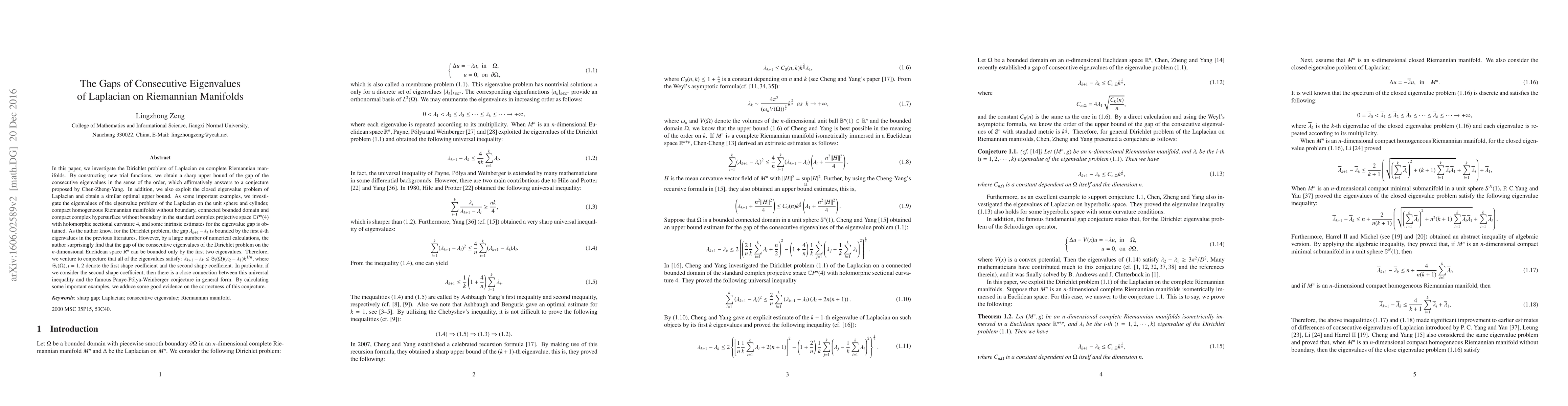 This paper investigates the Dirichlet problem of Laplacian on Riemannian manifolds, establishing a sharp upper bound for the gap between consecutive eigenvalues using new trial functions. It supports a conjecture by Chen-Zheng-Yang and explores eigenvalue problems on various manifolds, finding surprising numerical evidence supporting a universal inequality related to the Panye-Pólya-Weinberger conjecture.
