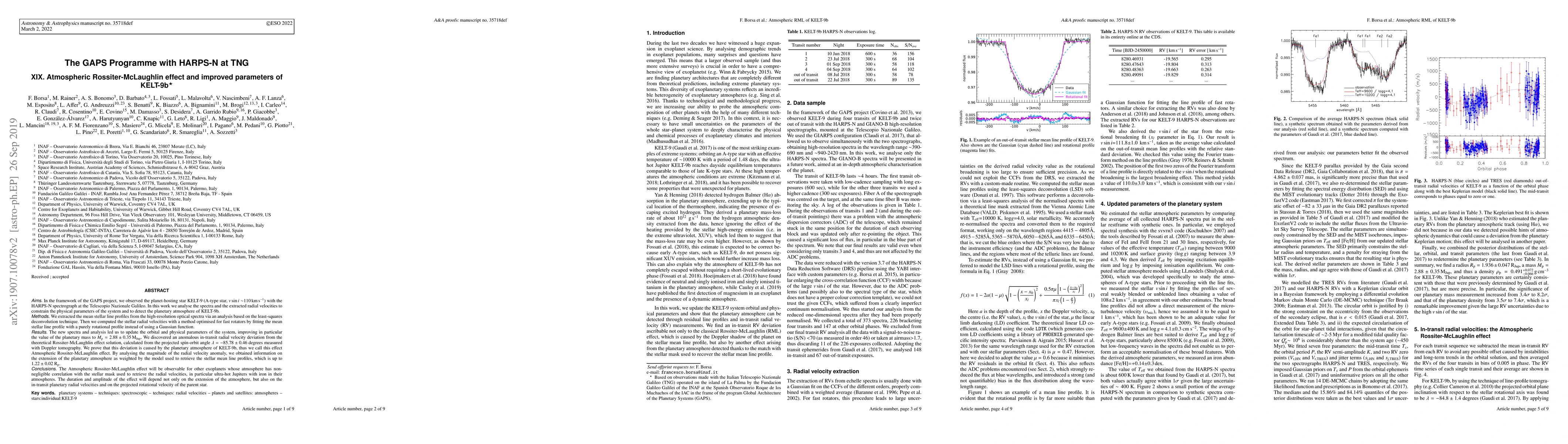 This study, part of the GAPS programme, uses HARPS-N spectrograph data to refine the parameters of KELT-9b, an ultra-hot Jupiter orbiting an A-type star. The analysis reveals an anomalous in-transit radial velocity deviation, termed the Atmospheric Rossiter-McLaughlin effect, caused by the planet's atmosphere, providing insights into its extension and the potential for observing similar effects in other ultra-hot Jupiters.