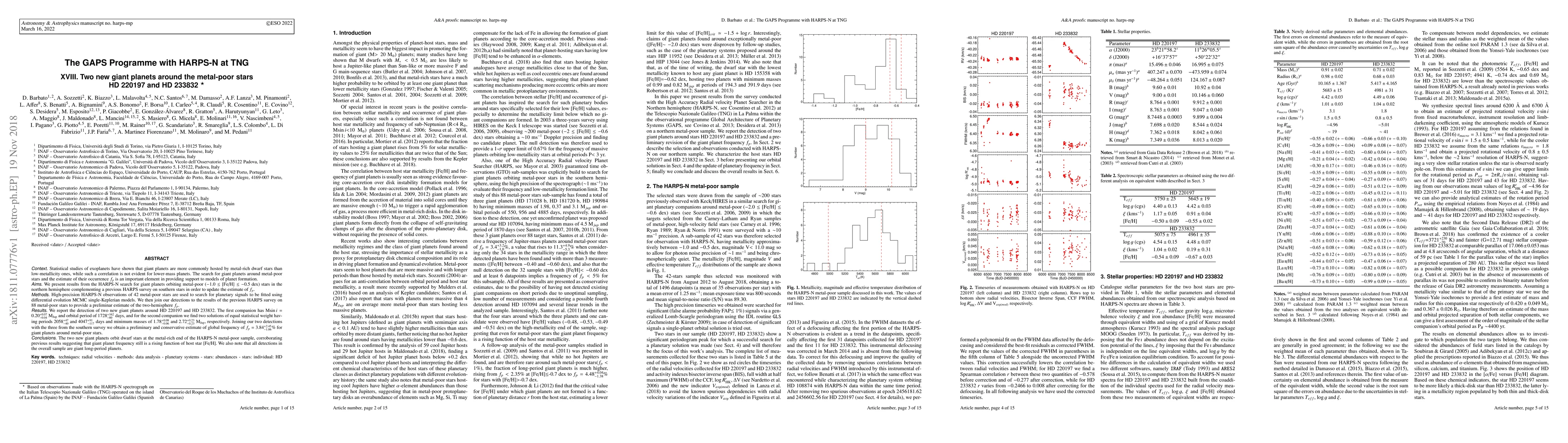 This study reports the discovery of two new giant planets orbiting the metal-poor stars HD 220197 and HD 233832 using high-precision HARPS-N observations. The findings contribute to updating the frequency of giant planets around metal-poor stars, estimating a global frequency of $f_p=3.84_{-1.06}^{+2.45}\%$.