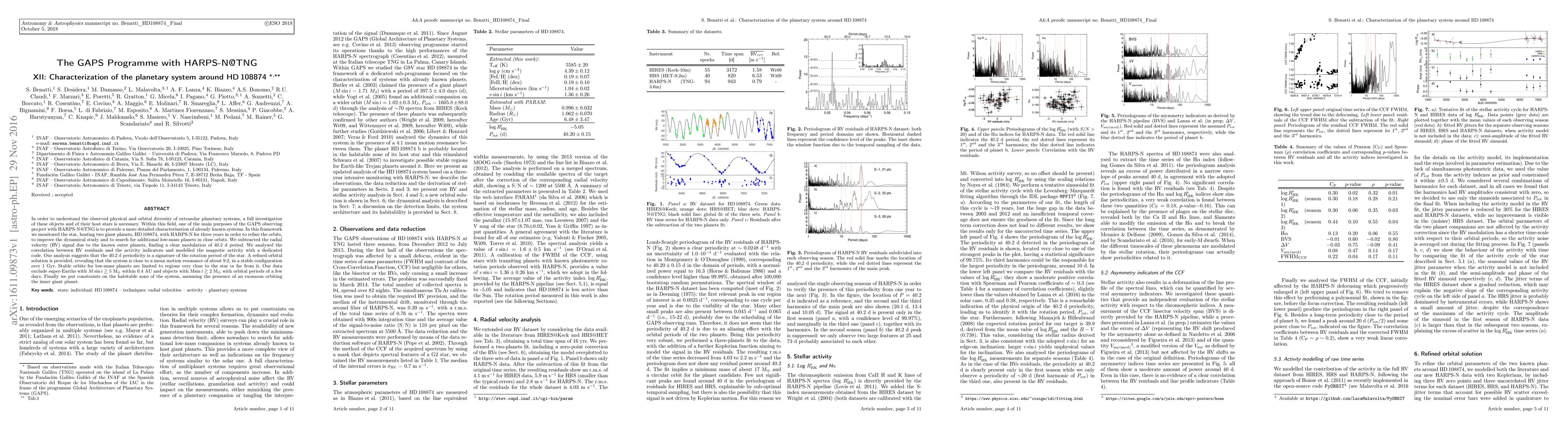 In order to understand the observed physical and orbital diversity of extrasolar planetary systems, a full investigation of these objects and of their host stars is necessary. Within this field, one of the main purposes of the GAPS observing project with HARPS-N@TNG is to provide a more detailed characterisation of already known systems. In this framework we monitored the star, hosting two giant planets, HD108874, with HARPS-N for three years in order to refine the orbits, to improve the dynamical study and to search for additional low-mass planets in close orbits. We subtracted the radial velocity (RV) signal due to the known outer planets, finding a clear modulation of 40.2 d period. We analysed the correlation between RV residuals and the activity indicators and modelled the magnetic activity with a dedicated code. Our analysis suggests that the 40.2 d periodicity is a signature of the rotation period of the star. A refined orbital solution is provided, revealing that the system is close to a mean motion resonance of about 9:2, in a stable configuration over 1 Gyr. Stable orbits for low-mass planets are limited to regions very close to the star or far from it. Our data exclude super-Earths with Msin i \gtrsim 5 M_Earth within 0.4 AU and objects with Msin i \gtrsim 2 M_Earth with orbital periods of a few days. Finally we put constraints on the habitable zone of the system, assuming the presence of an exomoon orbiting the inner giant planet.