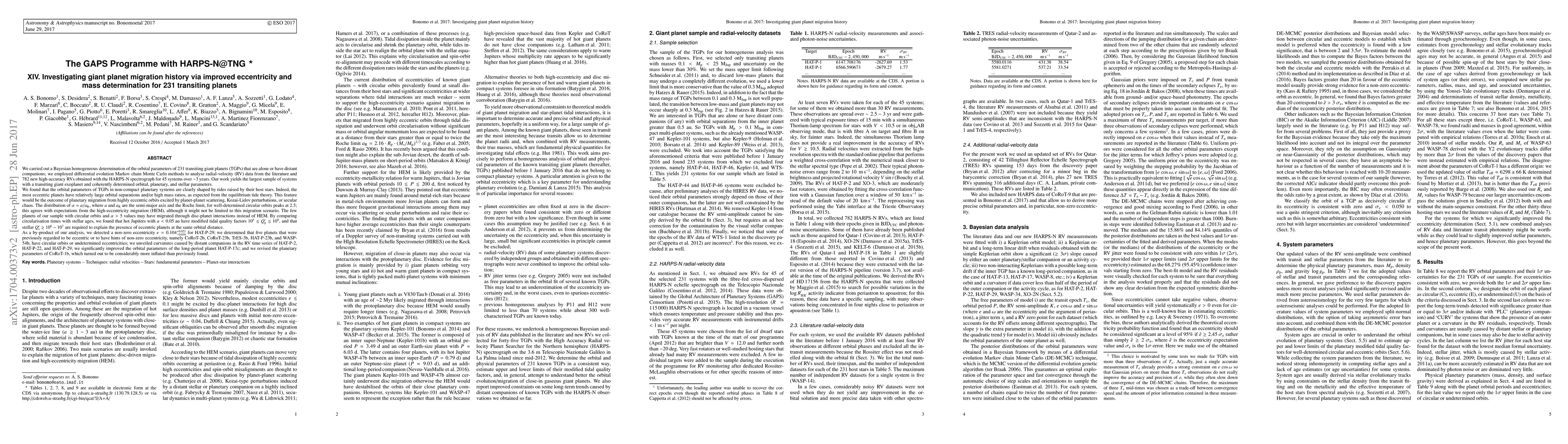 We carried out a Bayesian homogeneous determination of the orbital parameters of 231 transiting giant planets (TGPs) that are alone or have distant companions; we employed DE-MCMC methods to analyse radial-velocity (RV) data from the literature and 782 new high-accuracy RVs obtained with the HARPS-N spectrograph for 45 systems over 3 years. Our work yields the largest sample of systems with a transiting giant exoplanet and coherently determined orbital, planetary, and stellar parameters. We found that the orbital parameters of TGPs in non-compact planetary systems are clearly shaped by tides raised by their host stars. Indeed, the most eccentric planets have relatively large orbital separations and/or high mass ratios, as expected from the equilibrium tide theory. This feature would be the outcome of high-eccentricity migration (HEM). The distribution of $\alpha=a/a_R$, where $a$ and $a_R$ are the semi-major axis and the Roche limit, for well-determined circular orbits peaks at 2.5; this also agrees with expectations from the HEM. The few planets of our sample with circular orbits and $\alpha >5$ values may have migrated through disc-planet interactions instead of HEM. By comparing circularisation times with stellar ages, we found that hot Jupiters with $a < 0.05$ au have modified tidal quality factors $10^{5} < Q'_p < 10^{9}$, and that stellar $Q'_s > 10^{6}-10^{7}$ are required to explain the presence of eccentric planets at the same orbital distance. As a by-product of our analysis, we detected a non-zero eccentricity for HAT-P-29; we determined that five planets that were previously regarded to have hints of non-zero eccentricity have circular orbits or undetermined eccentricities; we unveiled curvatures caused by distant companions in the RV time series of HAT-P-2, HAT-P-22, and HAT-P-29; and we revised the planetary parameters of CoRoT-1b.