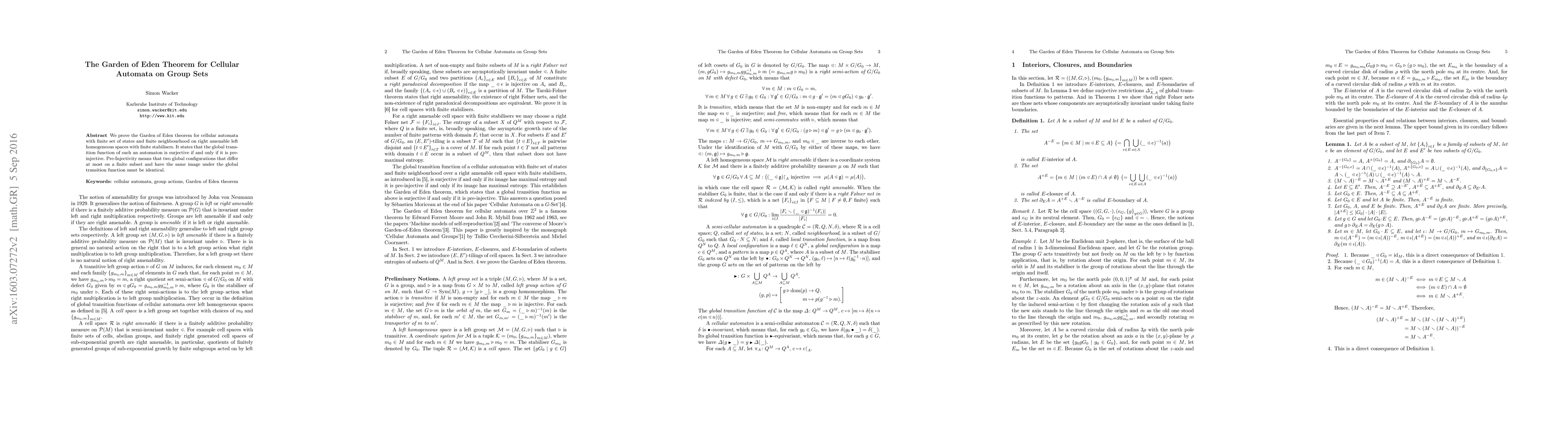 The Garden of Eden theorem is proven for cellular automata on right amenable left homogeneous spaces, showing that surjectivity of the global transition function is equivalent to pre-injectivity, where identical configurations differing only on a finite subset must map to the same state.