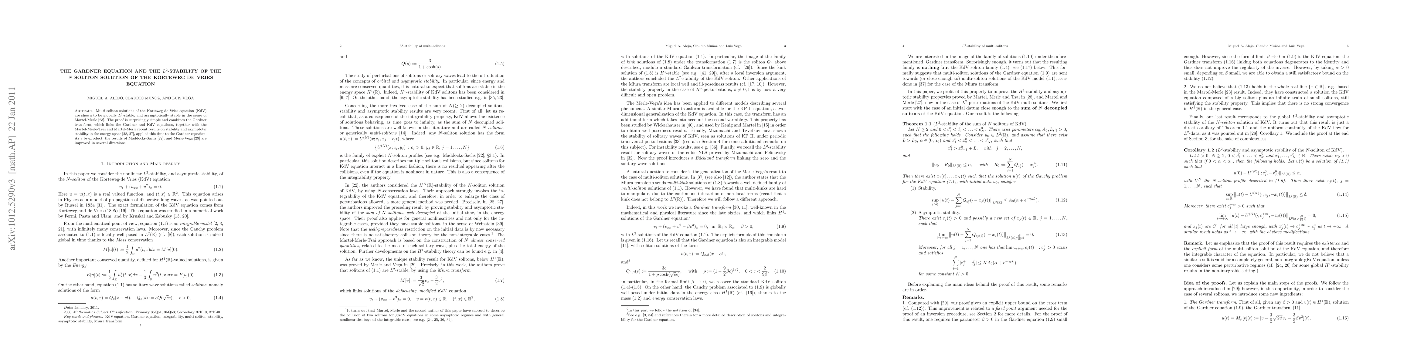This paper demonstrates the global L^2-stability and asymptotic stability of N-soliton solutions of the KdV equation using the Gardner transform, linking it with the Gardner equation and leveraging recent results on stability. The findings also enhance previous results by Maddocks-Sachs and Merle-Vega.