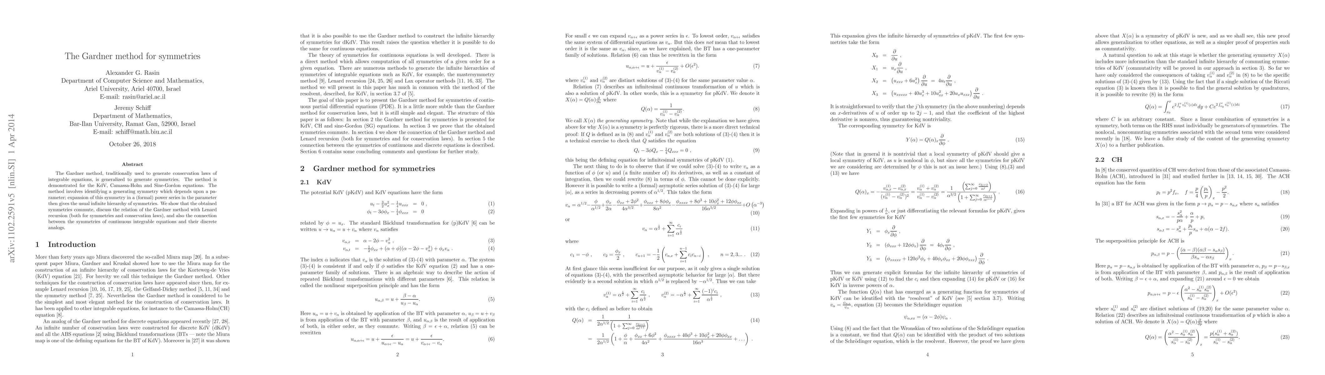 The Gardner method is generalized to generate symmetries for integrable equations, demonstrated for KdV, Camassa-Holm, and Sine-Gordon equations. The method reveals commuting symmetries and connects with Lenard recursion and the symmetries of discrete integrable systems.