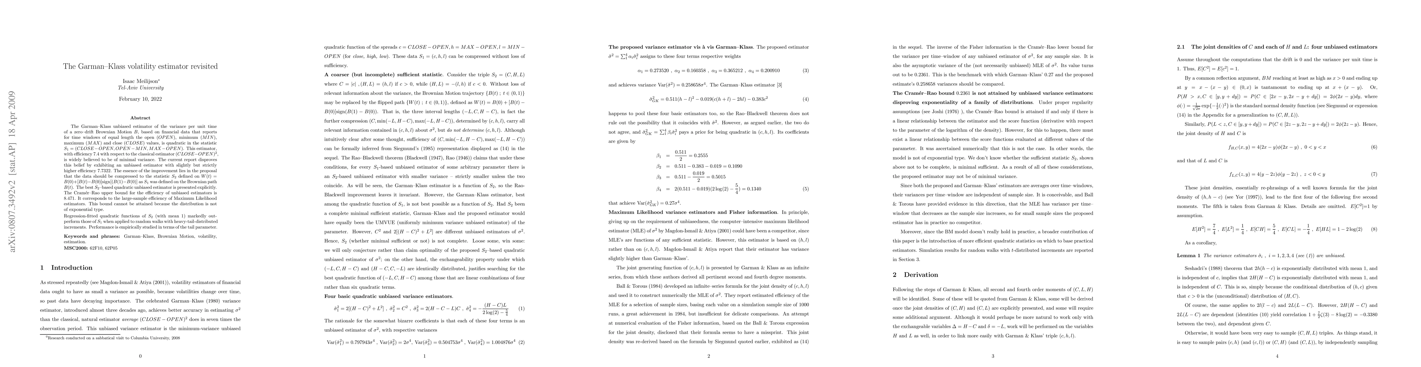 The Garman-Klass unbiased estimator of the variance per unit time of a zero-drift Brownian Motion B, based on the usual financial data that reports for time windows of equal length the open (OPEN), minimum (MIN), maximum (MAX) and close (CLOSE) values, is quadratic in the statistic S1=(CLOSE-OPEN, OPEN-MIN, MAX-OPEN). This estimator, with efficiency 7.4 with respect to the classical estimator (CLOSE-OPEN)^2, is widely believed to be of minimal variance. The current report disproves this belief by exhibiting an unbiased estimator with slightly but strictly higher efficiency 7.7322. The essence of the improvement lies in the observation that the data should be compressed to the statistic S2 defined on W(t)= B(0)+[B(t)-B(0)]sign[(B(1)-B(0)] as S1 was defined on the Brownian path B(t). The best S2-based quadratic unbiased estimator is presented explicitly. The Cramer-Rao upper bound for the efficiency of unbiased estimators, corresponding to the efficiency of large-sample Maximum Likelihood estimators, is 8.471. This bound cannot be attained because the distribution is not of exponential type. Regression-fitted quadratic functions of S2 (with mean 1) markedly out-perform those of S1 when applied to random walks with heavy-tail-distributed increments. Performance is empirically studied in terms of the tail parameter.