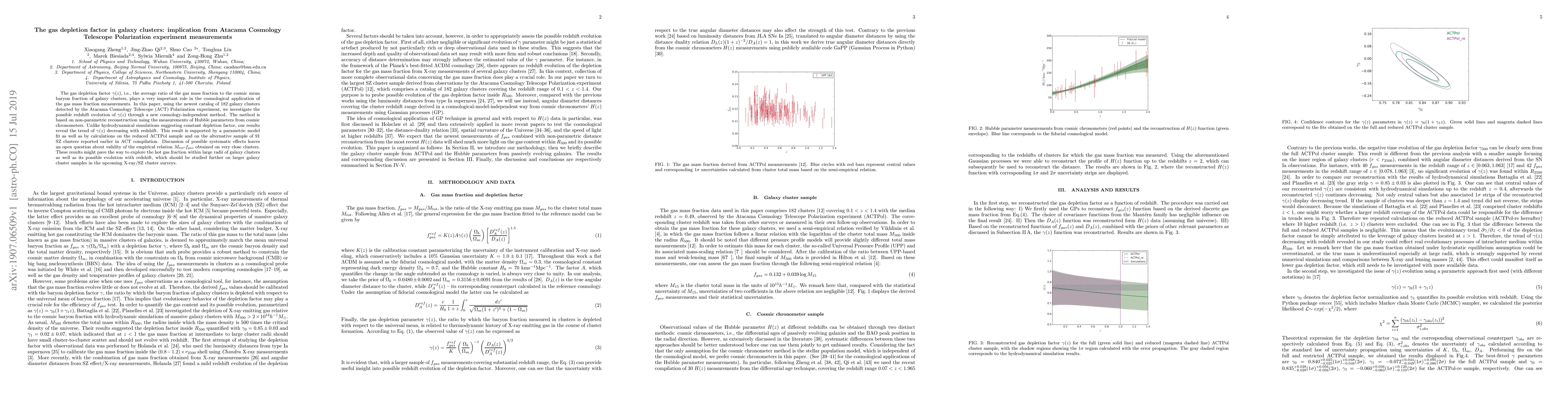 The gas depletion factor $\gamma(z)$, i.e., the average ratio of the gas mass fraction to the cosmic mean baryon fraction of galaxy clusters, plays a very important role in the cosmological application of the gas mass fraction measurements. In this paper, using the newest catalog of 182 galaxy clusters detected by the Atacama Cosmology Telescope (ACT) Polarization experiment, we investigate the possible redshift evolution of $\gamma(z)$ through a new cosmology-independent method. The method is based on non-parametric reconstruction using the measurements of Hubble parameters from cosmic chronometers. Unlike hydrodynamical simulations suggesting constant depletion factor, our results reveal the trend of $\gamma(z)$ decreasing with redshift. This result is supported by a parametric model fit as well as by calculations on the reduced ACTPol sample and on the alternative sample of 91 SZ clusters reported earlier in ACT compilation. Discussion of possible systematic effects leaves an open question about validity of the empirical relation $M_{tot}$-$f_{gas}$ obtained on very close clusters. These results might pave the way to explore the hot gas fraction within large radii of galaxy clusters as well as its possible evolution with redshift, which should be studied further on larger galaxy cluster samples in the upcoming X-ray/SZ cluster surveys.