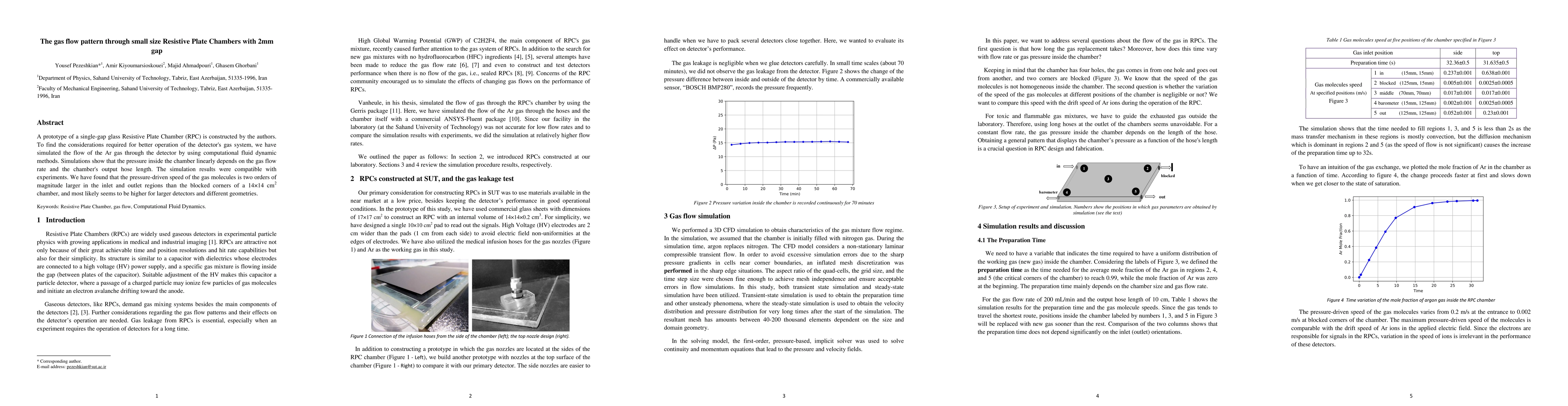 A prototype of a single-gap glass Resistive Plate Chamber (RPC) is constructed by the authors. To find the considerations required for better operation of the detector's gas system, we have simulated the flow of the Ar gas through the detector by using computational fluid dynamic methods. Simulations show that the pressure inside the chamber linearly depends on the gas flow rate and the chamber's output hose length. The simulation results were compatible with experiments. We have found that the pressure-driven speed of the gas molecules is two orders of magnitude larger in the inlet and outlet regions than the blocked corners of a 14x14 cm2 chamber, and most likely seems to be higher for larger detectors and different geometries.