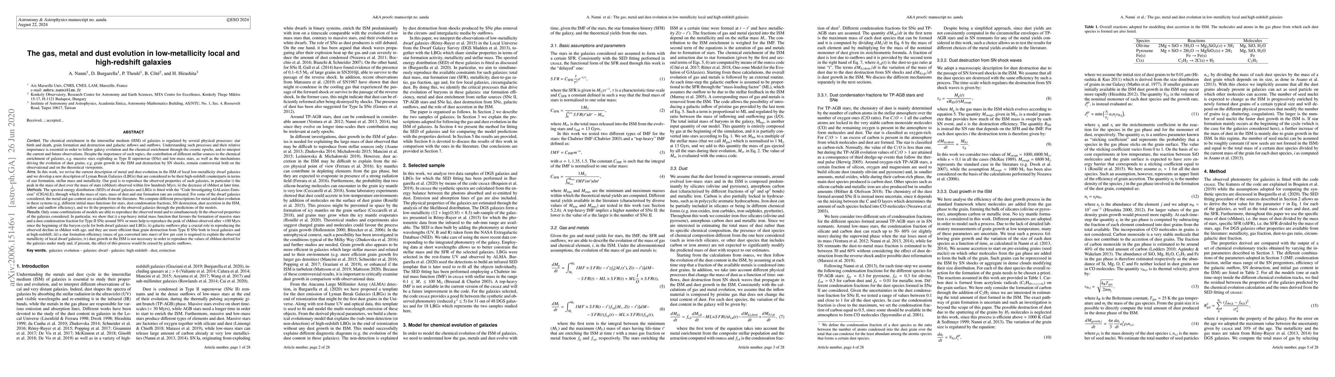This paper investigates the chemical evolution of low-metallicity galaxies, focusing on the evolution of gas, metals, and dust in both local dwarf galaxies and high-redshift Lyman Break Galaxies. The study finds that a top-heavy initial mass function and galactic outflows are crucial for explaining the observed peak and subsequent decline in dust-to-star mass ratio, while dust growth in the interstellar medium is not necessary.