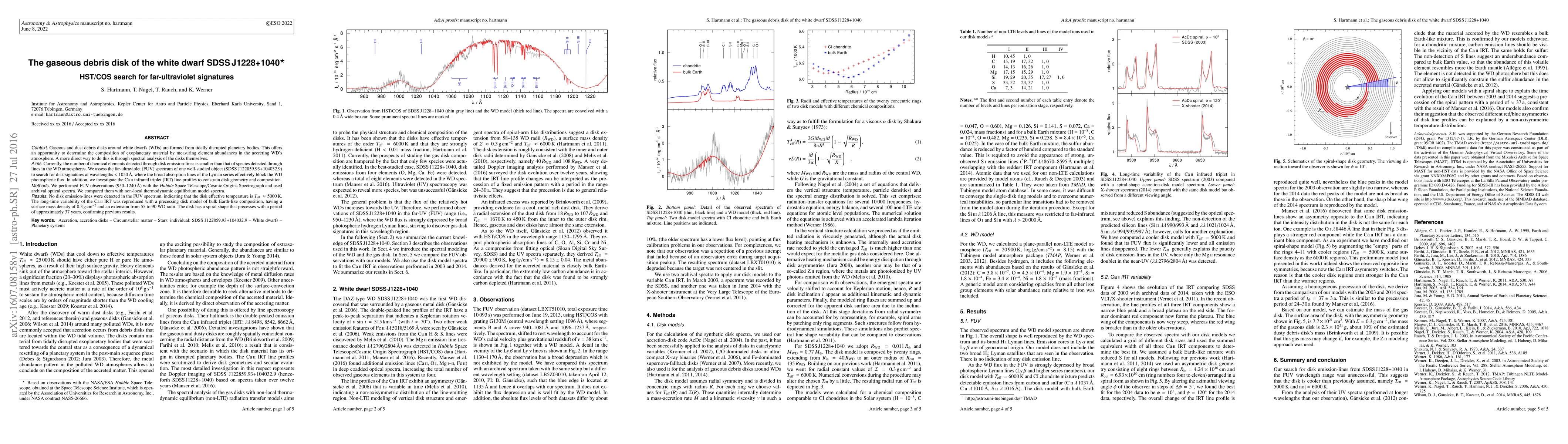 This study uses HST/COS to search for far-ultraviolet signatures of the gaseous debris disk around the white dwarf SDSS J1228+1040, finding no disk emission-lines. The Ca II infrared triplet lines suggest a disk with Earth-like composition, precessing over a period of 37 years.
