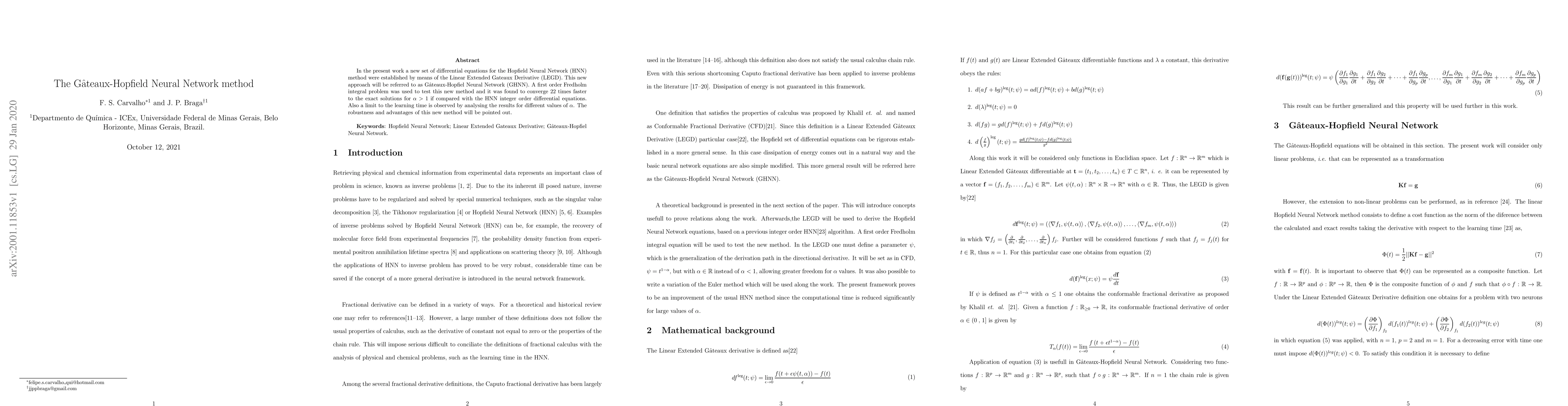 In the present work a new set of differential equations for the Hopfield Neural Network (HNN) method were established by means of the Linear Extended Gateaux Derivative (LEGD). This new approach will be referred to as G\^ateaux-Hopfiel Neural Network (GHNN). A first order Fredholm integral problem was used to test this new method and it was found to converge 22 times faster to the exact solutions for {\alpha} > 1 if compared with the HNN integer order differential equations. Also a limit to the learning time is observed by analysing the results for different values of {\alpha}. The robustness and advantages of this new method will be pointed out.