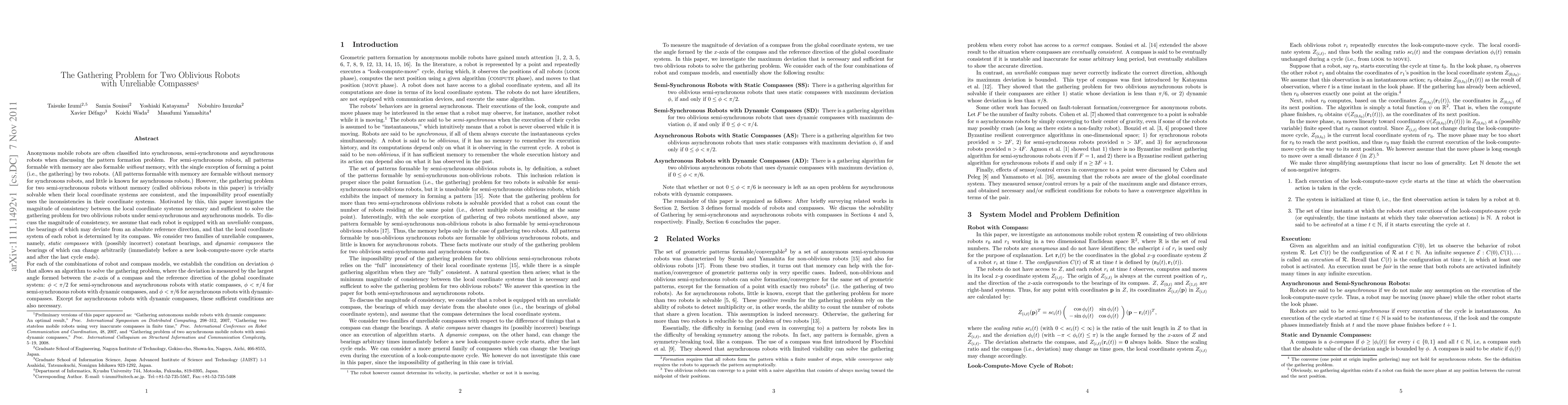 This paper explores the gathering problem for two oblivious robots under semi-synchronous and asynchronous models, focusing on the consistency of their local coordinate systems determined by unreliable compasses. It establishes conditions on compass deviation that allow solving the gathering problem, finding that \phi < \pi/2 for static compasses, \phi < \pi/4 for dynamic compasses in semi-synchronous robots, and \phi < \pi/6 for dynamic compasses in asynchronous robots.