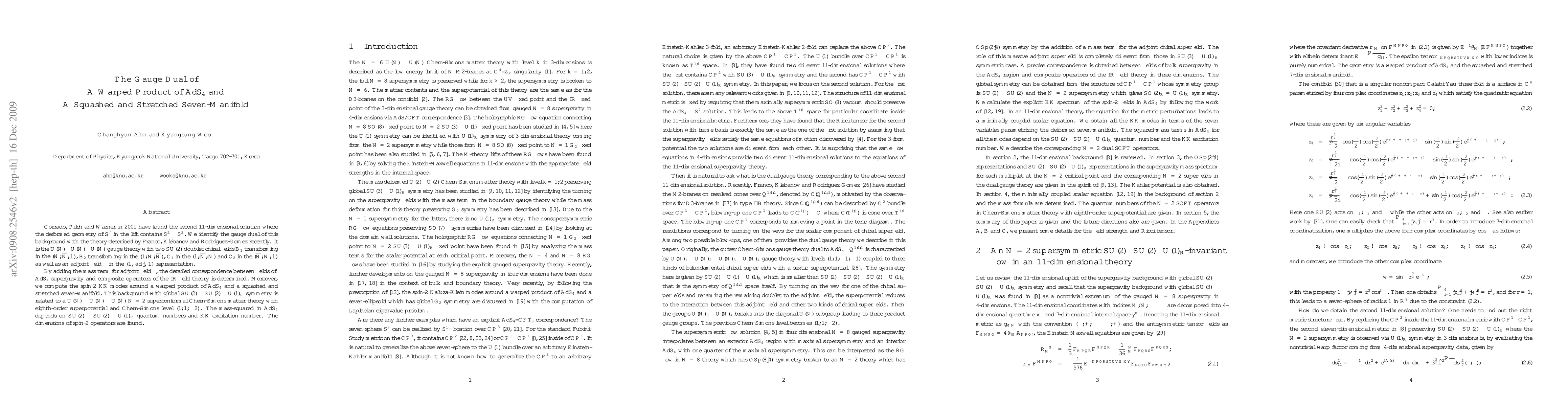 Corrado, Pilch and Warner in 2001 have found the second 11-dimensional solution where the deformed geometry of S^7 in the lift contains S^2 x S^2. We identify the gauge dual of this background with the theory described by Franco, Klebanov and Rodriguez-Gomez recently. It is the U(N) x U(N) x U(N) gauge theory with two SU(2) doublet chiral fields B_1 transforming in the (N, Nbar, 1), B_2 transforming in the (1, N, Nbar), C_1 in the (1, Nbar, N) and C_2 in the (Nbar, N, 1) as well as an adjoint field \Phi in the (1, adj, 1) representation. By adding the mass term for adjoint field \Phi, the detailed correspondence between fields of AdS_4 supergravity and composite operators of the IR field theory is determined. Moreover, we compute the spin-2 KK modes around a warped product of AdS_4 and a squashed and stretched seven-manifold. This background with global SU(2) x SU(2) x U(1)_R symmetry is related to a U(N) x U(N) x U(N) N=2 superconformal Chern-Simons matter theory with eighth-order superpotential and Chern-Simons level (1,1,-2). The mass-squared in AdS_4 depends on SU(2) x SU(2) x U(1)_R quantum numbers and KK excitation number. The dimensions of spin-2 operators are found.