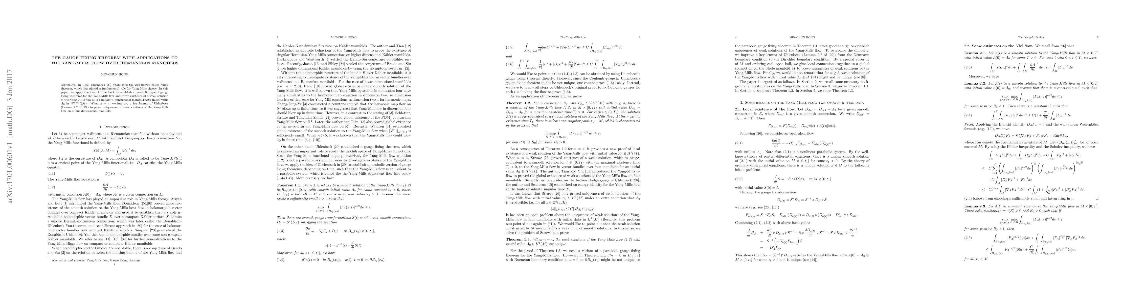 This paper extends Uhlenbeck's 1982 gauge fixing theorem to the Yang-Mills flow on Riemannian manifolds, proving the existence of weak solutions and improving uniqueness for four-dimensional manifolds. The work builds on Uhlenbeck's foundational ideas to address the flow's behavior on compact $n$-dimensional manifolds.