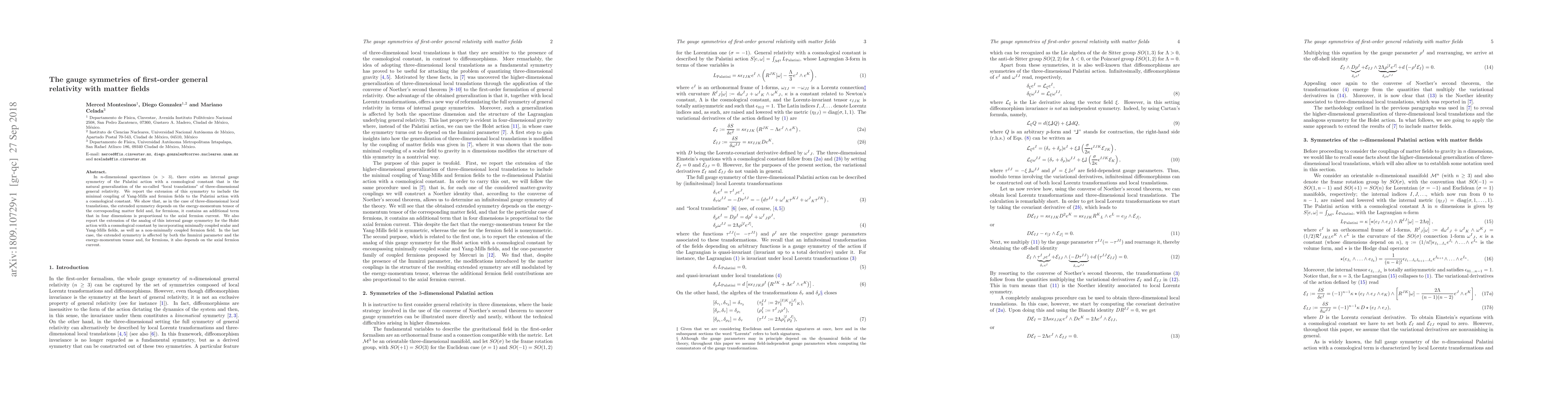 In $n$-dimensional spacetimes ($n>3$), there exists an internal gauge symmetry of the Palatini action with a cosmological constant that is the natural generalization of the so-called "local translations" of three-dimensional general relativity. We report the extension of this symmetry to include the minimal coupling of Yang-Mills and fermion fields to the Palatini action with a cosmological constant. We show that, as in the case of three-dimensional local translations, the extended symmetry depends on the energy-momentum tensor of the corresponding matter field and, for fermions, it contains an additional term that in four dimensions is proportional to the axial fermion current. We also report the extension of the analog of this internal gauge symmetry for the Holst action with a cosmological constant by incorporating minimally coupled scalar and Yang-Mills fields, as well as a non-minimally coupled fermion field. In the last case, the extended symmetry is affected by both the Immirzi parameter and the energy-momentum tensor and, for fermions, it also depends on the axial fermion current.