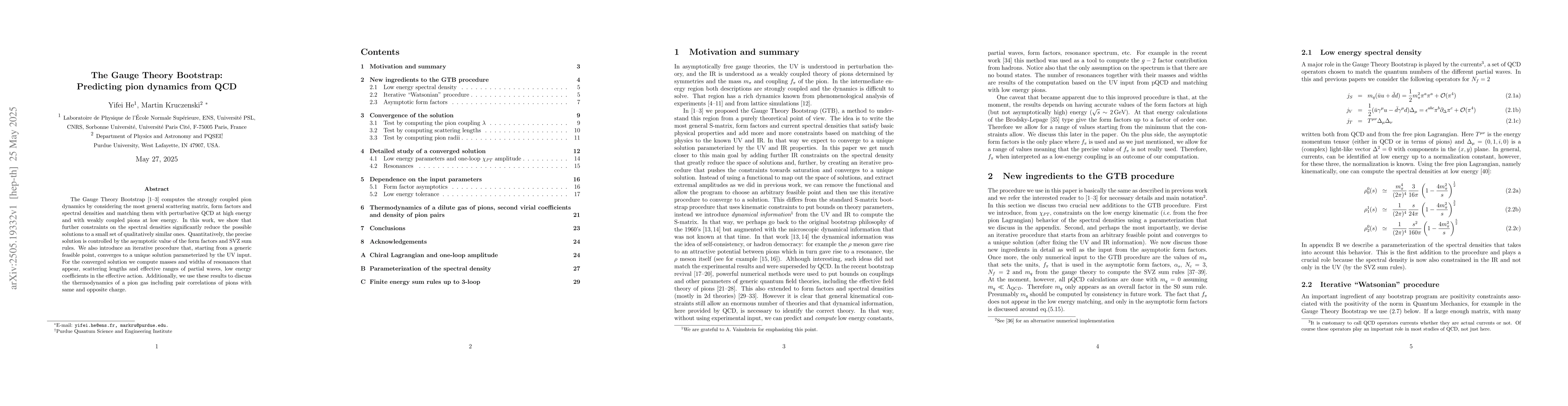 The Gauge Theory Bootstrap [arXiv:2309.12402, arXiv:2403.10772] computes the strongly coupled pion dynamics by considering the most general scattering matrix, form factors and spectral densities and matching them with perturbative QCD at high energy and with weakly coupled pions at low energy. In this work, we show that further constraints on the spectral densities significantly reduce the possible solutions to a small set of qualitatively similar ones. Quantitatively, the precise solution is controlled by the asymptotic value of the form factors and SVZ sum rules. We also introduce an iterative procedure that, starting from a generic feasible point, converges to a unique solution parameterized by the UV input. For the converged solution we compute masses and widths of resonances that appear, scattering lengths and effective ranges of partial waves, low energy coefficients in the effective action. Additionally, we use these results to discuss the thermodynamics of a pion gas including pair correlations of pions with same and opposite charge.