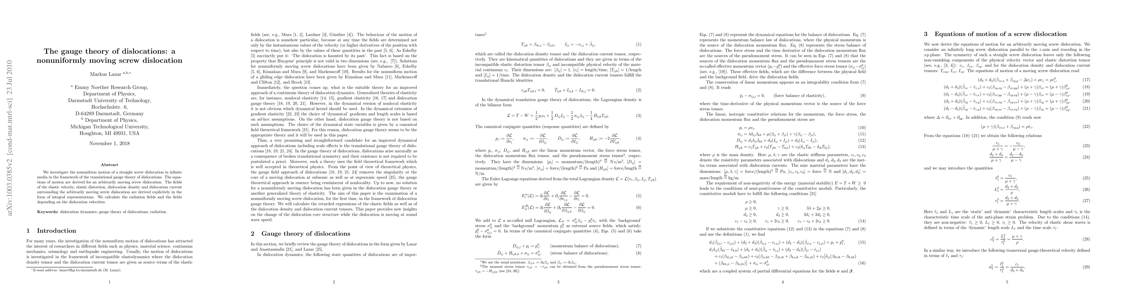 This paper explores the nonuniform motion of a straight screw dislocation in infinite media using translational gauge theory, deriving equations of motion and explicit integral representations for the associated elastic fields and radiation, and analyzing the effects of varying dislocation velocities.