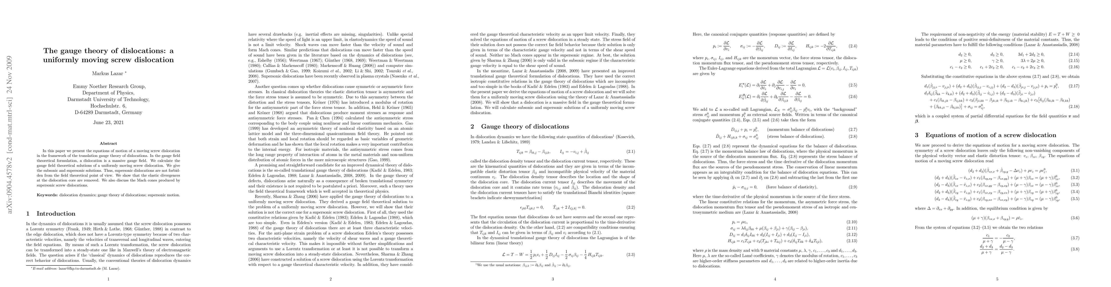This paper develops the equations of motion for a uniformly moving screw dislocation within the translation gauge theory, revealing that supersonic dislocations are permissible theoretically. It shows how elastic divergences near the dislocation core are eliminated and discusses the formation of Mach cones by supersonic dislocations.