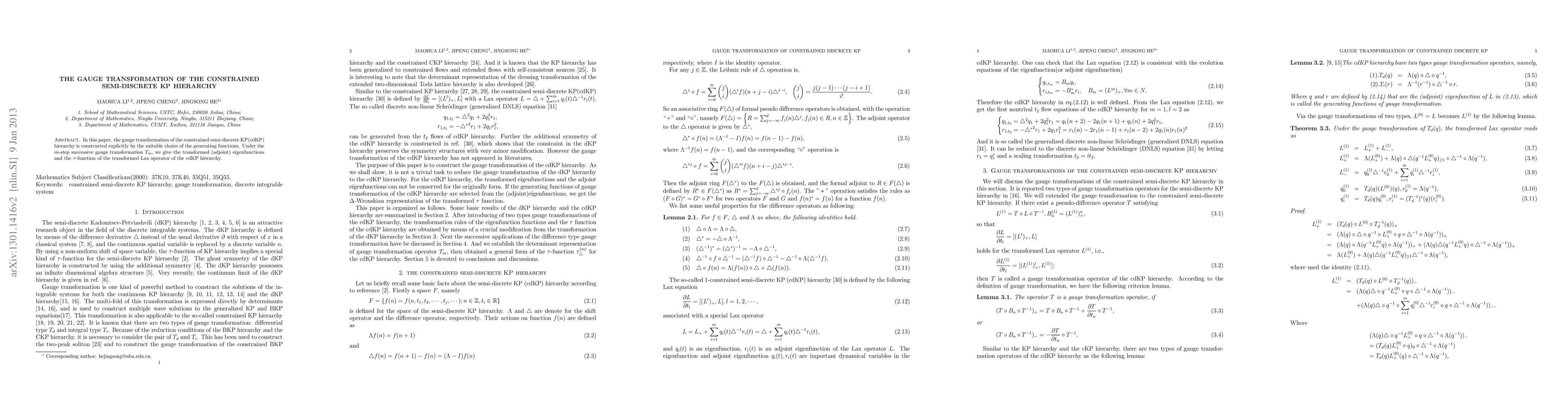This paper constructs the gauge transformation of the constrained semi-discrete KP (cdKP) hierarchy using specific generating functions. It provides transformed adjoint eigenfunctions and the $\tau$-function for the transformed Lax operator under an $m$-step gauge transformation $T_m$.