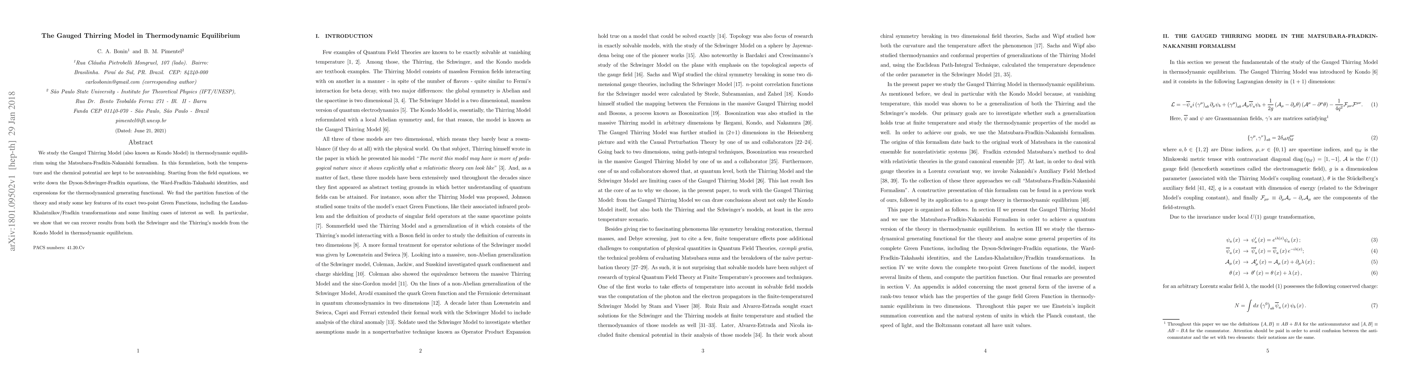 The Gauged Thirring Model is studied in thermodynamic equilibrium using the Matsubara-Fradkin-Nakanishi formalism, recovering results from Schwinger and Thirring's models.
