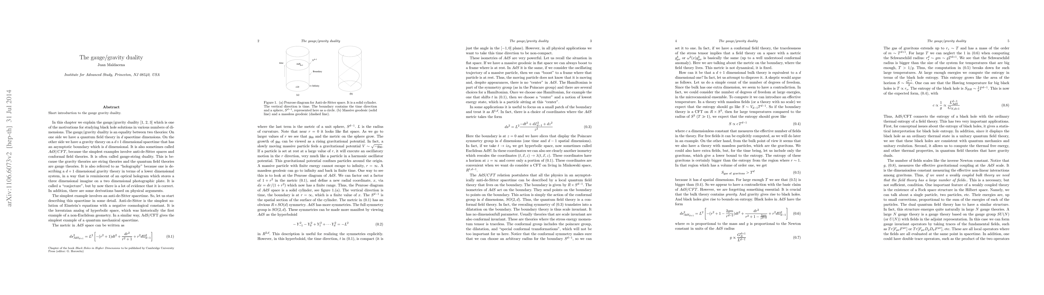 The gauge/gravity duality, also known as the AdS/CFT correspondence, establishes a profound connection between certain types of quantum field theories (QFTs) and theories of general relativity in higher-dimensional spaces, revolutionizing our understanding of quantum gravity and strongly coupled systems. This duality provides a powerful tool for studying complex quantum systems through classical gravitational analogs.
