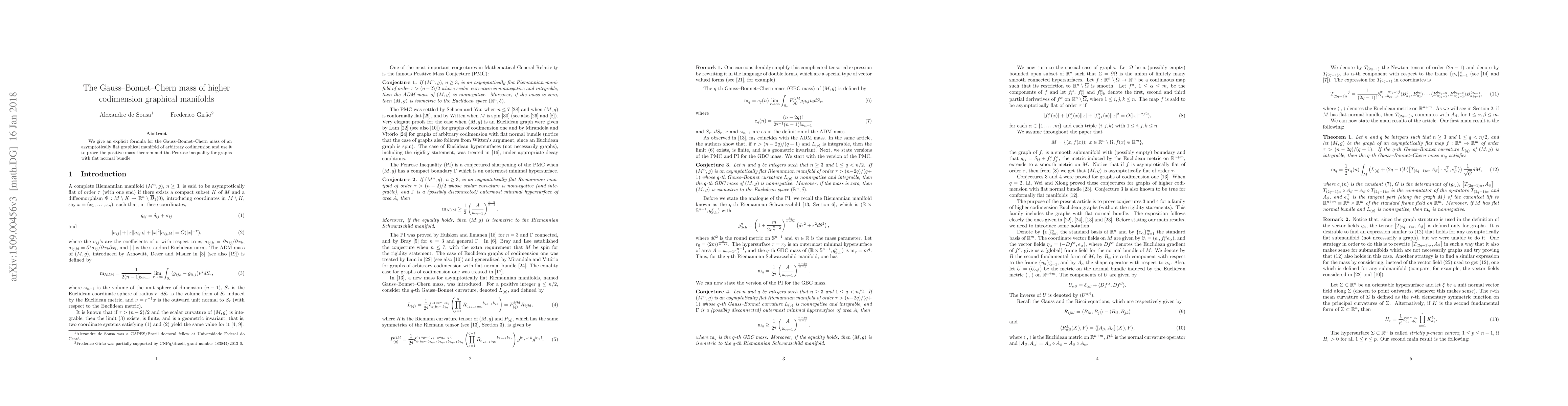 Summary: This paper provides an explicit formula for the Gauss-Bonnet-Chern mass of higher codimension graphical manifolds and applies it to prove the positive mass theorem and the Penrose inequality for graphs with a flat normal bundle.