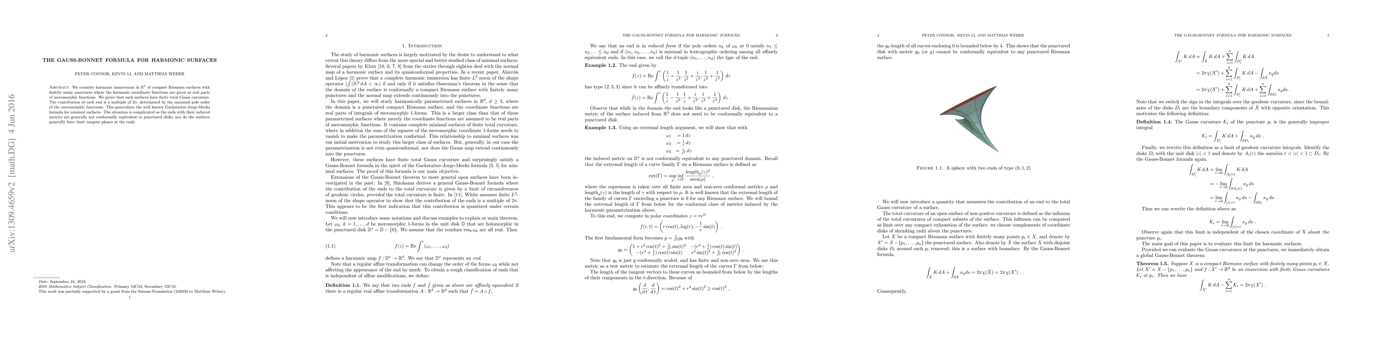 We consider harmonic immersions in $\R^{\N}$ of compact Riemann surfaces with finitely many punctures where the harmonic coordinate functions are given as real parts of meromorphic functions. We prove that such surfaces have finite total Gauss curvature. The contribution of each end is a multiple of $2\pi$, determined by the maximal pole order of the meromorphic functions. This generalizes the well known Gackstatter-Jorge-Meeks formula for minimal surfaces. The situation is complicated as the ends are generally not conformally equivalent to punctured disks, nor does the surface have limit tangent planes.