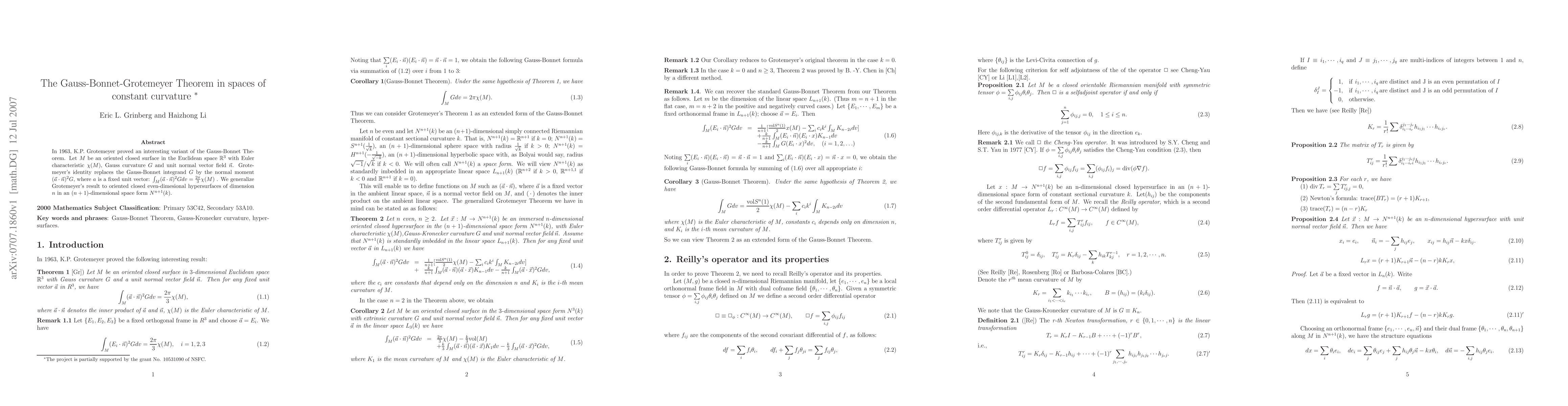 Summary: Grotemeyer's theorem, originally for surfaces in R^3, is generalized to even-dimensional hypersurfaces in spaces of constant curvature, showing that the integral of a modified curvature term relates to the Euler characteristic by a constant factor.