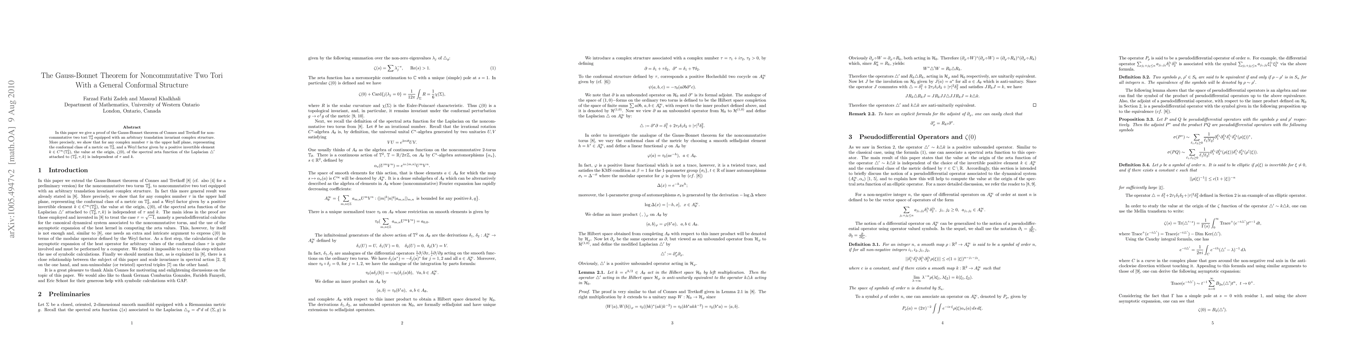 The paper introduces a detailed proof of the Gauss-Bonnet theorem for noncommutative two tori, utilizing advanced concepts from noncommutative geometry and spectral theory.