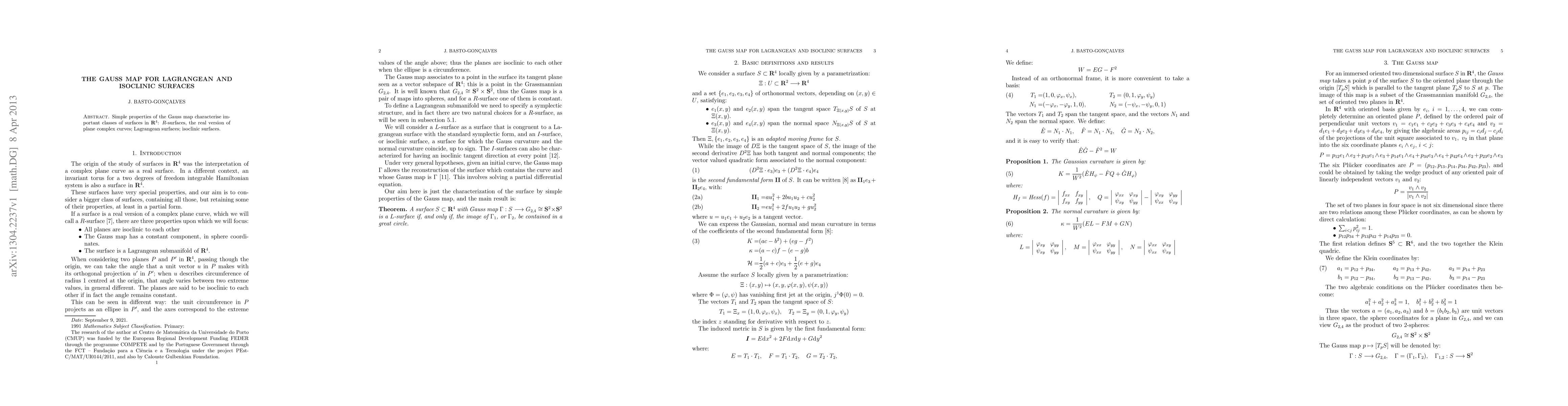 Simple properties of the Gauss map characterise important classes of surfaces in $\Rq$: $R$-surfaces, the real version of plane complex curves; Lagrangean surfaces; isoclinic surfaces.