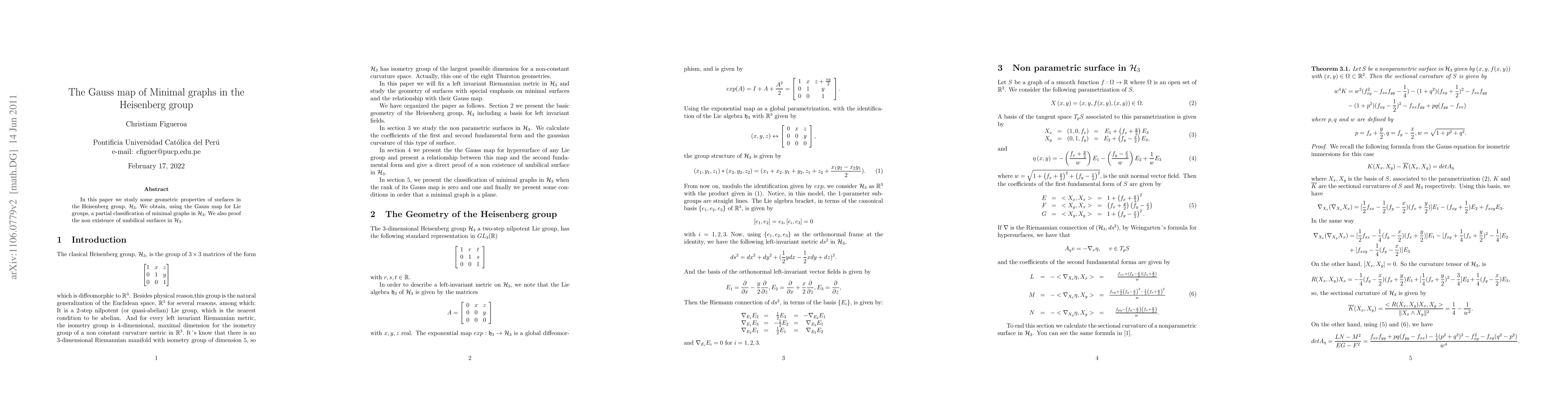 This paper explores geometric properties of surfaces in the Heisenberg group $\mathcal{H}_{3}$ and classifies minimal graphs using the Gauss map for Lie groups. It also proves the nonexistence of umbilical surfaces in $\mathcal{H}_{3}$.