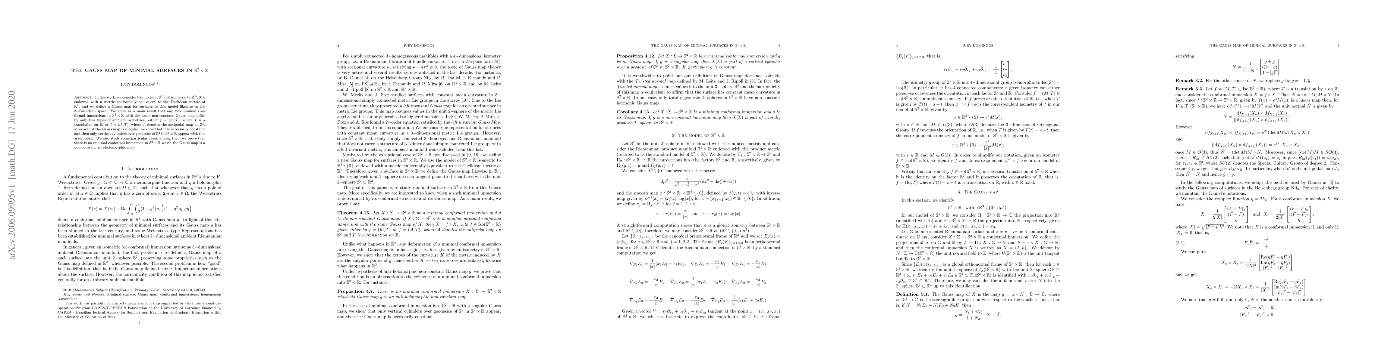 This research investigates minimal conformal immersions in the model $\mathbb{S}^2\times\mathbb{R}$, establishing that distinct minimal surfaces with the same non-constant Gauss map differ by specific ambient isometries. It concludes that singular Gauss maps are constant, leading to only vertical cylinders over geodesics.