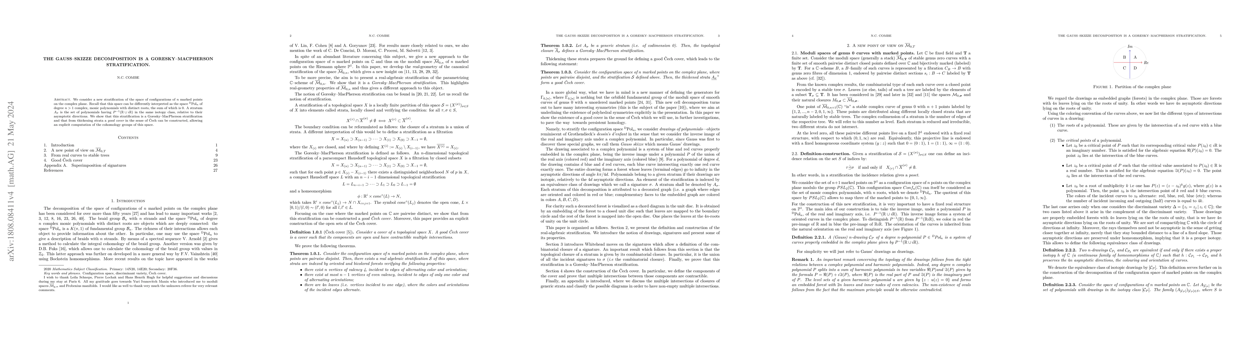 We consider a new stratification of the space of configurations of $n$ marked points on the complex plane. Recall that this space can be differently interpreted as the space $^{\rm D}{\rm Pol}_{n}$ of degree $n>1$ complex, monic polynomials with distinct roots, the sum of which is 0. A stratum $A_{\sigma}$ is the set of polynomials having $P^{-1}(\mathbb{R}\cup\imath\mathbb{R})$ in the same isotopy class, relative to their asymptotic directions. We show that this stratification is a Goresky--MacPherson stratification and that from thickening strata a good cover in the sense of \v{C}ech can be constructed, allowing an explicit computation of the cohomology groups of this space.