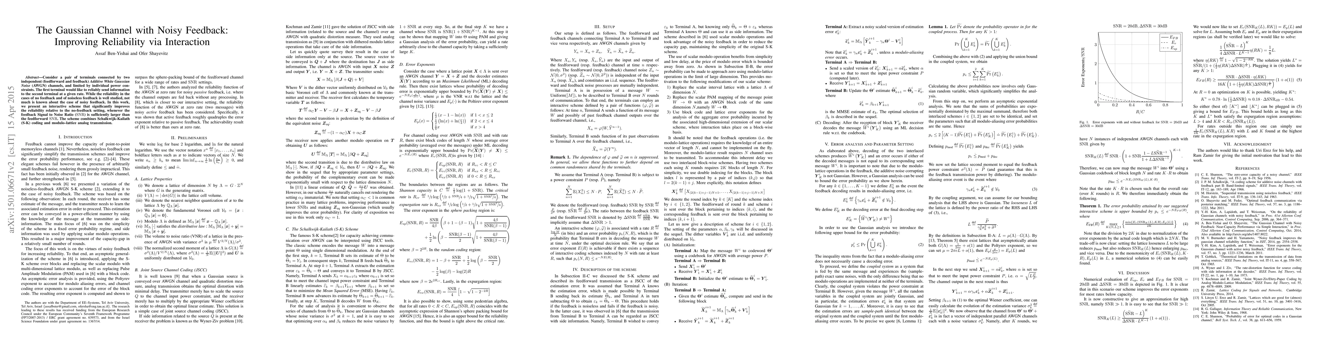 Consider a pair of terminals connected by two independent (feedforward and feedback) Additive White Gaussian Noise (AWGN) channels, and limited by individual power constraints. The first terminal would like to reliably send information to the second terminal at a given rate. While the reliability in the cases of no feedback and of noiseless feedback is well studied, not much is known about the case of noisy feedback. In this work, we present an interactive scheme that significantly improves the reliability relative to the no-feedback setting, whenever the feedback Signal to Noise Ratio (SNR) is sufficiently larger than the feedforward SNR. The scheme combines Schalkwijk-Kailath (S-K) coding and modulo--lattice analog transmission.