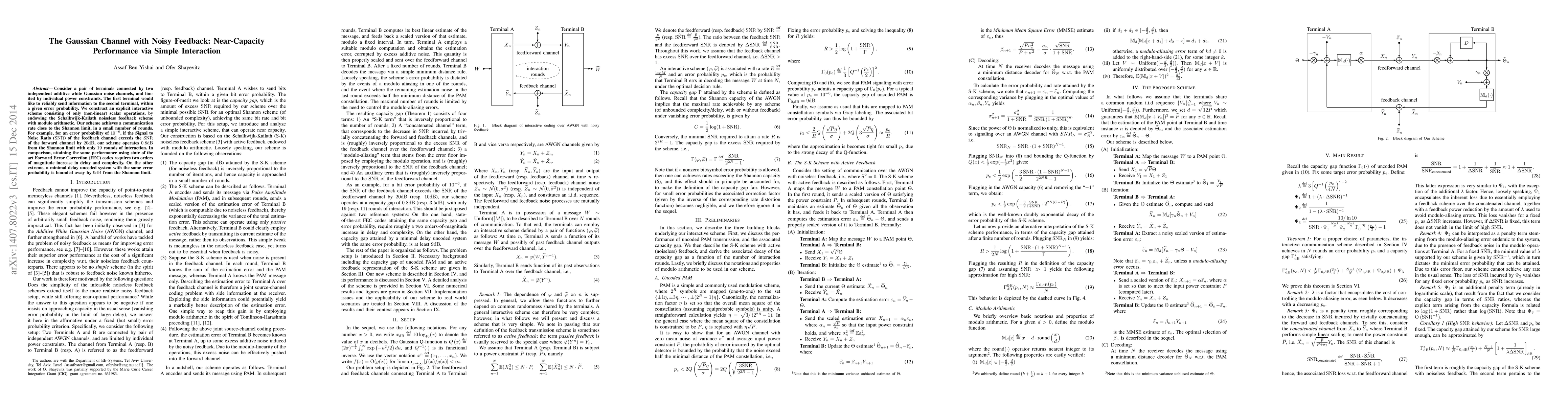 Consider a pair of terminals connected by two independent additive white Gaussian noise channels, and limited by individual power constraints. The first terminal would like to reliably send information to the second terminal, within a given error probability. We construct an explicit interactive scheme consisting of only (non-linear) scalar operations, by endowing the Schalkwijk-Kailath noiseless feedback scheme with modulo arithmetic. Our scheme achieves a communication rate close to the Shannon limit, in a small number of rounds. For example, for an error probability of $10^{-6}$, if the Signal to Noise Ratio ($\mathrm{SNR}$) of the feedback channel exceeds the $\mathrm{SNR}$ of the forward channel by $20\mathrm{dB}$, our scheme operates $0.8\mathrm{dB}$ from the Shannon limit with only $19$ rounds of interaction. In comparison, attaining the same performance using state of the art Forward Error Correction (FEC) codes requires two orders of magnitude increase in delay and complexity. On the other extreme, a minimal delay uncoded system with the same error probability is bounded away by $9\mathrm{dB}$ from the Shannon limit.