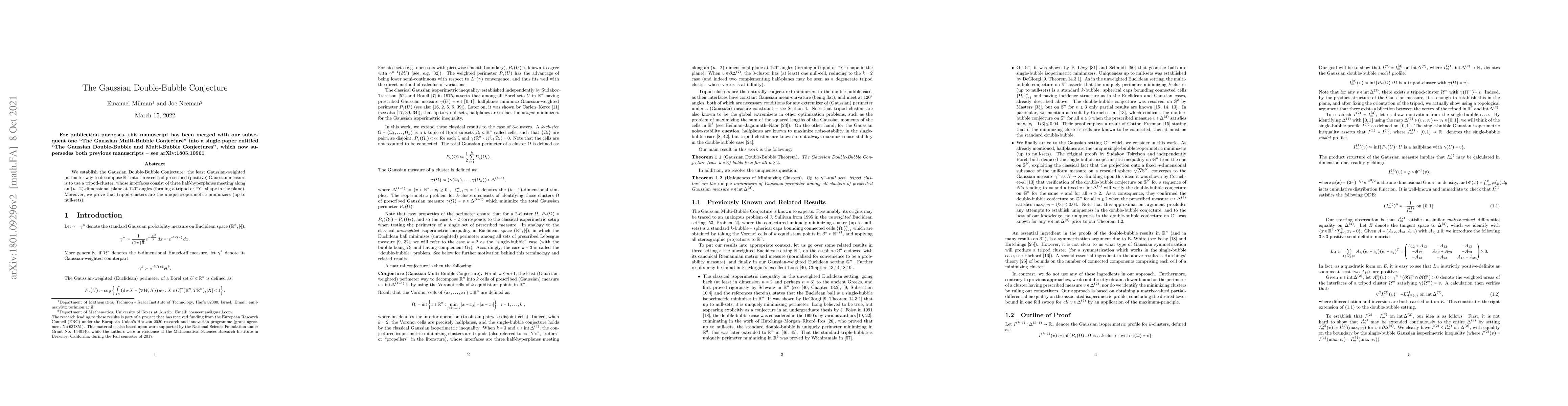 The Gaussian Double-Bubble Conjecture asserts that the optimal Gaussian-weighted perimeter decomposition of $\mathbb{R}^n$ into three regions with prescribed Gaussian measure forms a tripod-cluster with interfaces of three half-hyperplanes. This configuration is proven to be the unique isoperimetric minimizer.