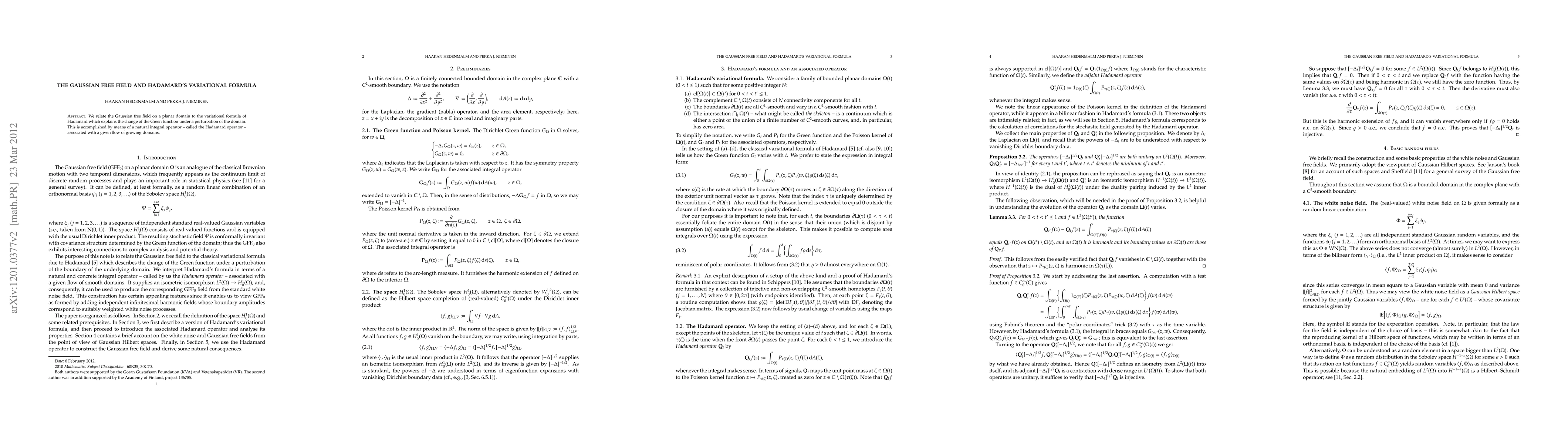 Summary: This paper connects the Gaussian free field on a planar domain to Hadamard's variational formula, which describes changes in the Green function due to domain perturbations, using a specific integral operator linked to Hadamard's formula.