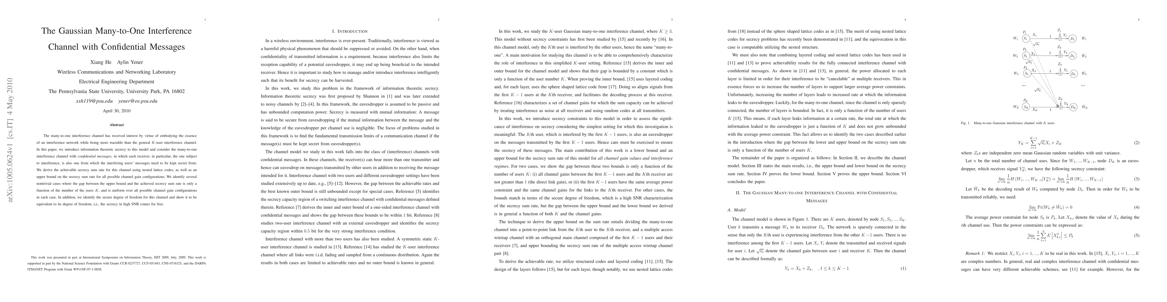 This paper investigates the Gaussian many-to-one interference channel with secrecy requirements, deriving achievable secrecy sum rates and upper bounds using nested lattice codes. The study reveals that high SNR achieves near-optimal secrecy sum rates, indicating that secrecy comes at no additional cost in terms of degrees of freedom.
