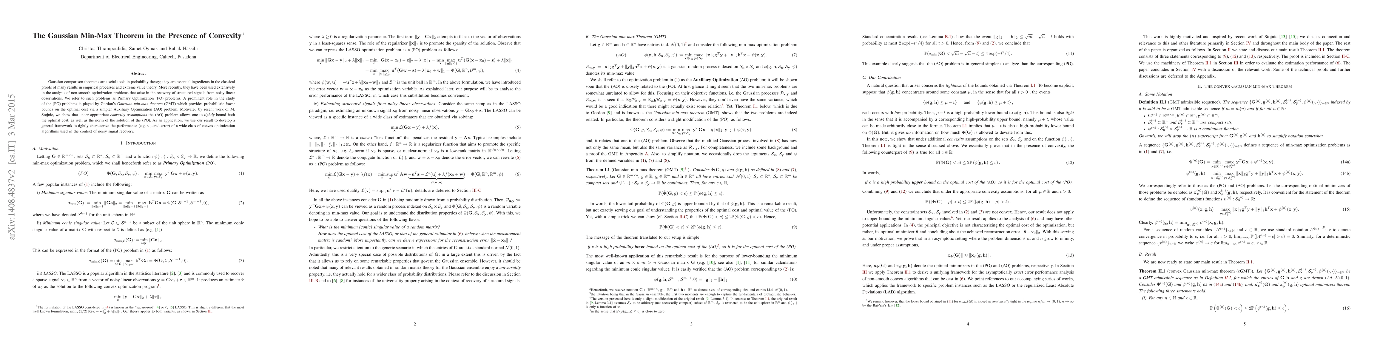 Gaussian comparison theorems are useful tools in probability theory; they are essential ingredients in the classical proofs of many results in empirical processes and extreme value theory. More recently, they have been used extensively in the analysis of non-smooth optimization problems that arise in the recovery of structured signals from noisy linear observations. We refer to such problems as Primary Optimization (PO) problems. A prominent role in the study of the (PO) problems is played by Gordon's Gaussian min-max theorem (GMT) which provides probabilistic lower bounds on the optimal cost via a simpler Auxiliary Optimization (AO) problem. Motivated by resent work of M. Stojnic, we show that under appropriate convexity assumptions the (AO) problem allows one to tightly bound both the optimal cost, as well as the norm of the solution of the (PO). As an application, we use our result to develop a general framework to tightly characterize the performance (e.g. squared-error) of a wide class of convex optimization algorithms used in the context of noisy signal recovery.