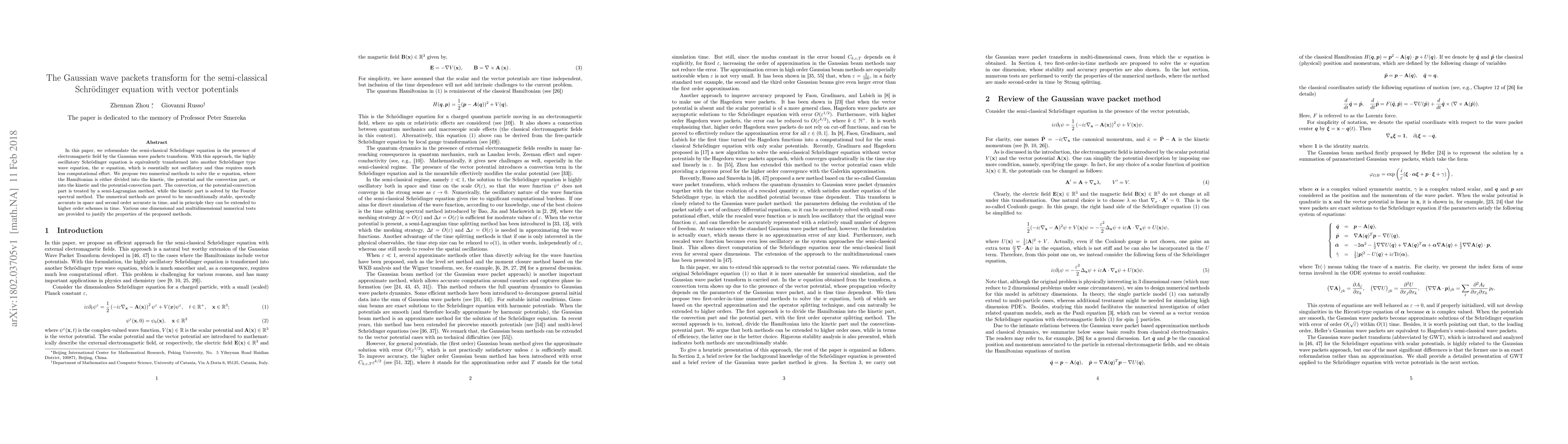 This paper reformulates the semi-classical Schrödinger equation with vector potentials using the Gaussian wave packets transform, transforming it into a non-oscillatory $w$ equation for easier computation. Two numerical methods are proposed to solve the $w$ equation, demonstrating unconditional stability, spectral accuracy, and second-order time accuracy, with tests confirming their effectiveness.