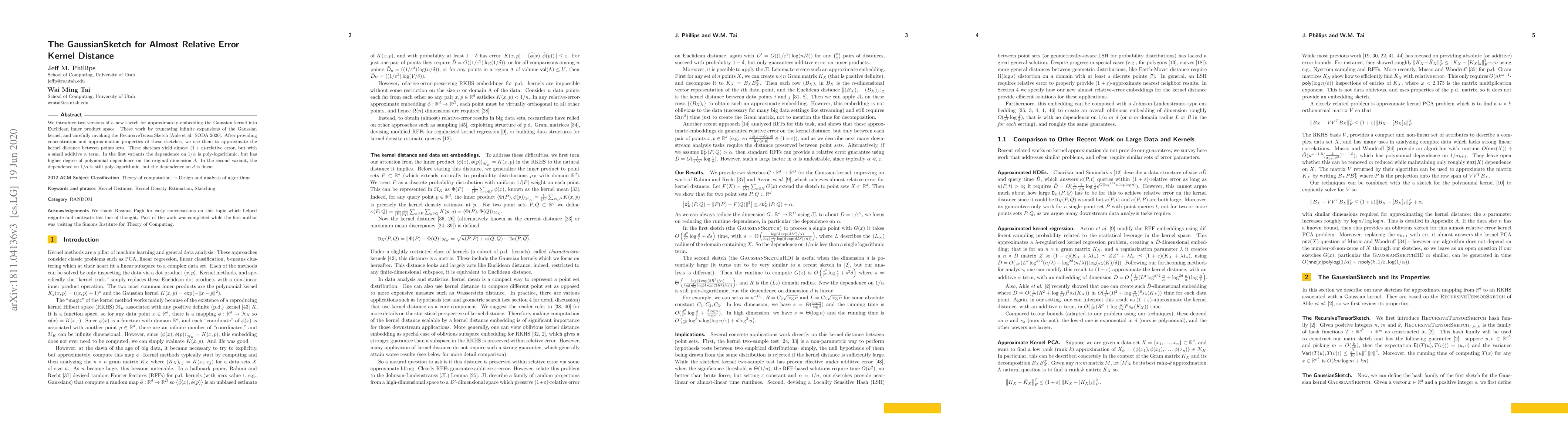 We introduce two versions of a new sketch for approximately embedding the Gaussian kernel into Euclidean inner product space. These work by truncating infinite expansions of the Gaussian kernel, and carefully invoking the RecursiveTensorSketch [Ahle et al. SODA 2020]. After providing concentration and approximation properties of these sketches, we use them to approximate the kernel distance between points sets. These sketches yield almost $(1+\varepsilon)$-relative error, but with a small additive $\alpha$ term. In the first variants the dependence on $1/\alpha$ is poly-logarithmic, but has higher degree of polynomial dependence on the original dimension $d$. In the second variant, the dependence on $1/\alpha$ is still poly-logarithmic, but the dependence on $d$ is linear.