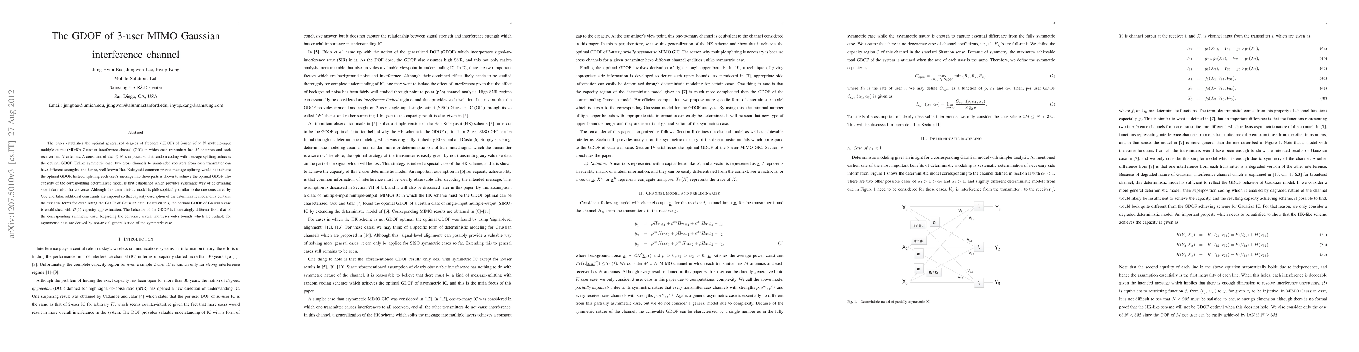 The paper determines the optimal generalized degrees of freedom (GDOF) for a 3-user MIMO Gaussian interference channel with asymmetric channel strengths, establishing that splitting each user's message into three parts achieves the optimal GDOF. The derived GDOF differs significantly from the symmetric case, with additional constraints on the deterministic model to simplify capacity description.