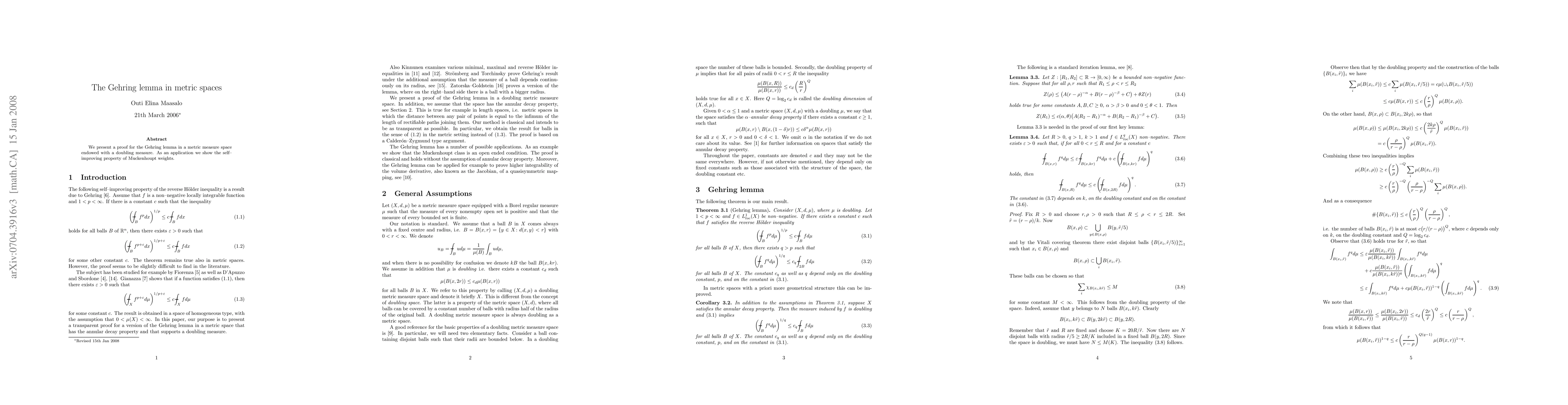 Summary: This paper provides a proof for the Gehring lemma in metric measure spaces with a doubling measure and demonstrates the self-improving property of Muckenhoupt weights as an application.