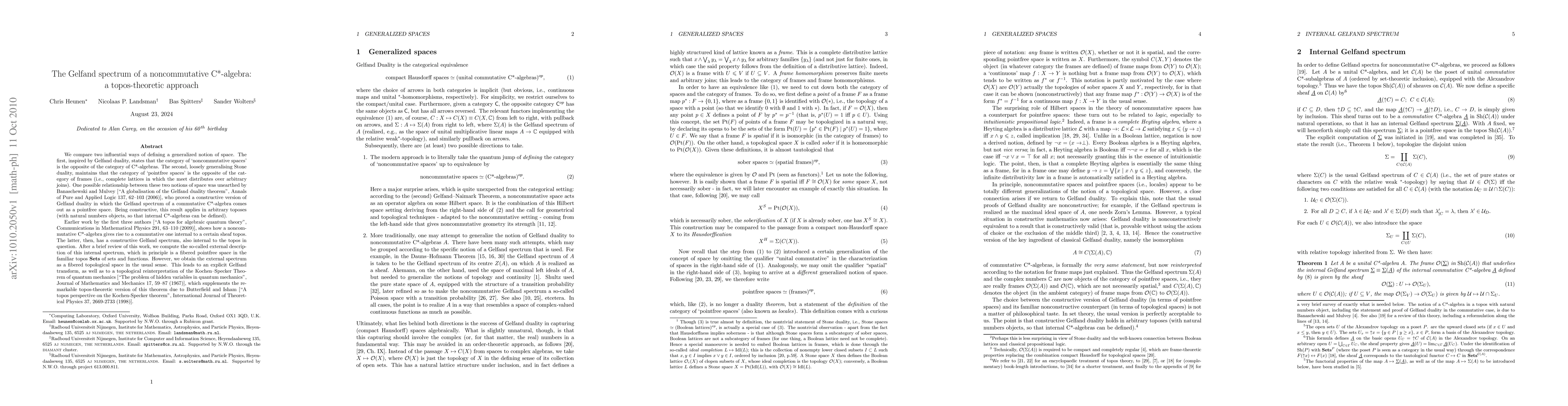 This paper compares two generalized notions of space: one based on Gelfand duality for noncommutative C*-algebras and the other inspired by Stone duality for pointfree spaces. The authors derive an explicit Gelfand transform and reinterpret the Kochen-Specker Theorem using a topos-theoretic approach, linking internal spectra of noncommutative C*-algebras to external topological spaces.