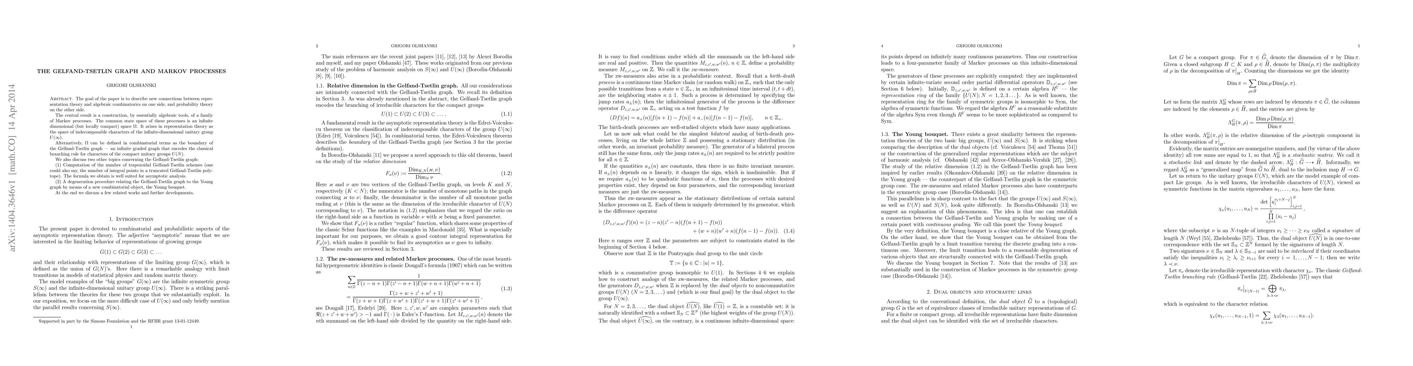 The goal of the paper is to describe new connections between representation theory and algebraic combinatorics on one side, and probability theory on the other side. The central result is a construction, by essentially algebraic tools, of a family of Markov processes. The common state space of these processes is an infinite dimensional (but locally compact) space Omega. It arises in representation theory as the space of indecomposable characters of the infinite-dimensional unitary group U(infinity). Alternatively, Omega can be defined in combinatorial terms as the boundary of the Gelfand-Tsetlin graph --- an infinite graded graph that encodes the classical branching rule for characters of the compact unitary groups U(N). We also discuss two other topics concerning the Gelfand-Tsetlin graph: (1) Computation of the number of trapezoidal Gelfand-Tsetlin schemes (one could also say, the number of integral points in a truncated Gelfand-Tsetlin polytope). The formula we obtain is well suited for asymptotic analysis. (2) A degeneration procedure relating the Gelfand-Tsetlin graph to the Young graph by means of a new combinatorial object, the Young bouquet. At the end we discuss a few related works and further developments.