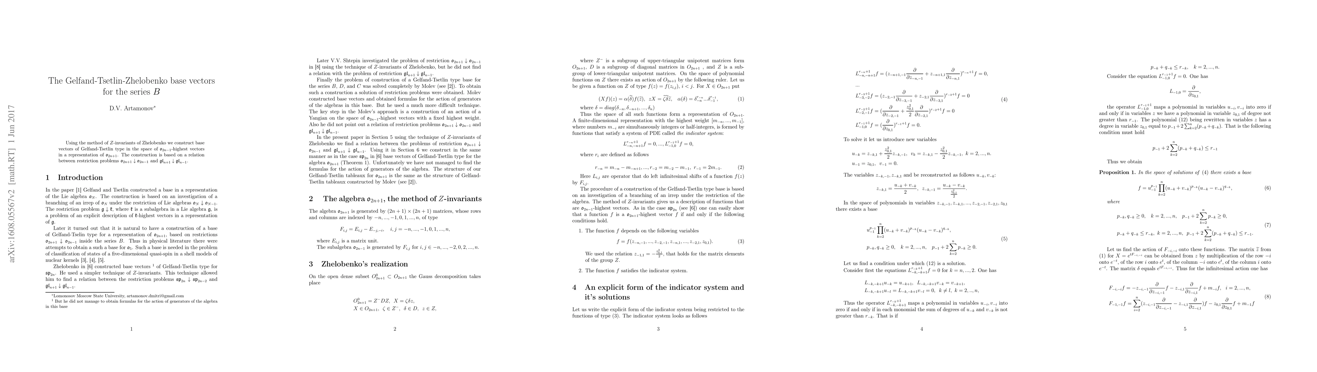 Summary: This paper constructs Gelfand-Tsetlin-Zhelobenko base vectors for $\mathfrak{o}_{2n+1}$ using $Z$-invariants, focusing on the restrictions $\mathfrak{o}_{2n+1}\downarrow\mathfrak{o}_{2n-1}$ and establishing a relation with $\mathfrak{gl}_{n+1}\downarrow\mathfrak{gl}_{n-1}$ representations.