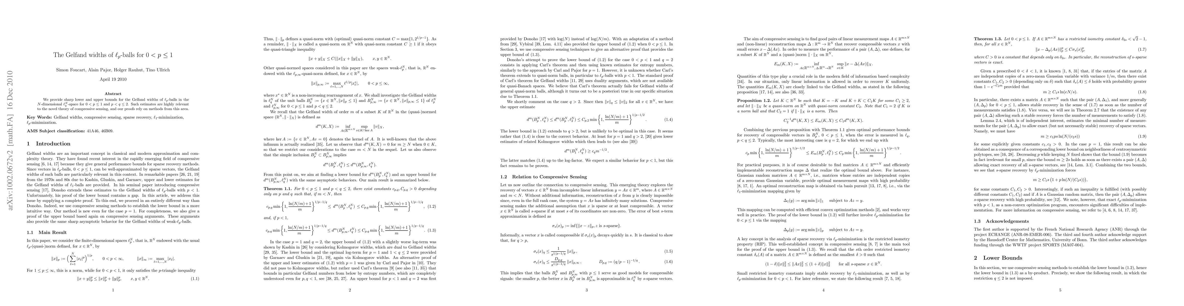 This paper presents sharp lower and upper bounds for the Gelfand widths of $ell_p$-balls in $N$-dimensional $ell_q^N$-space, for $0<pleq 1$ and $p<qleq 2$. The methodology employs techniques from compressive sensing theory, significantly contributing to this novel field.