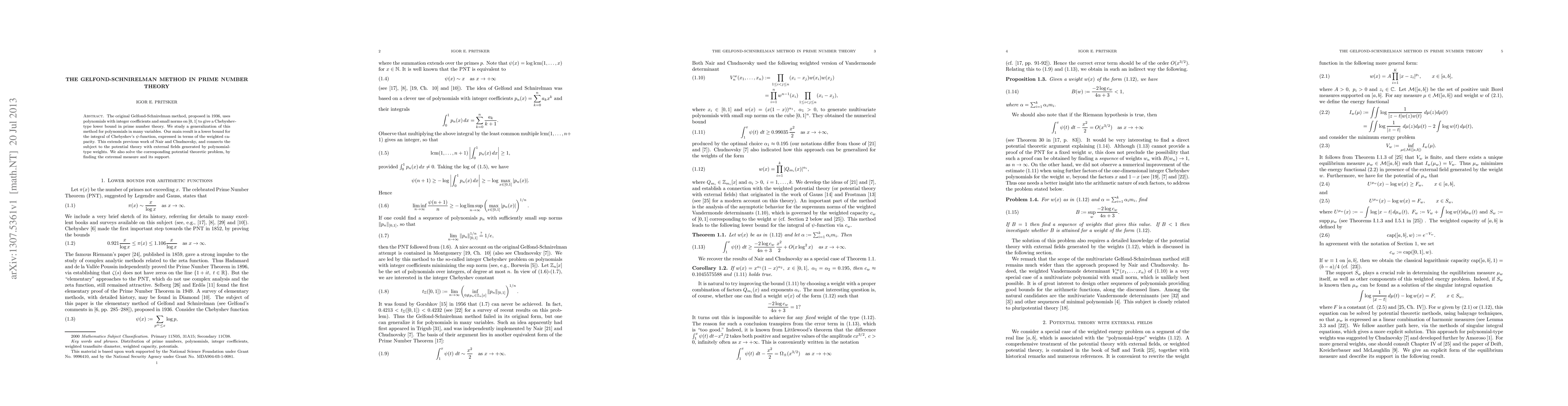 The original Gelfond-Schnirelman method, proposed in 1936, uses polynomials with integer coefficients and small norms on $[0,1]$ to give a Chebyshev-type lower bound in prime number theory. We study a generalization of this method for polynomials in many variables. Our main result is a lower bound for the integral of Chebyshev's $\psi$-function, expressed in terms of the weighted capacity. This extends previous work of Nair and Chudnovsky, and connects the subject to the potential theory with external fields generated by polynomial-type weights. We also solve the corresponding potential theoretic problem, by finding the extremal measure and its support.