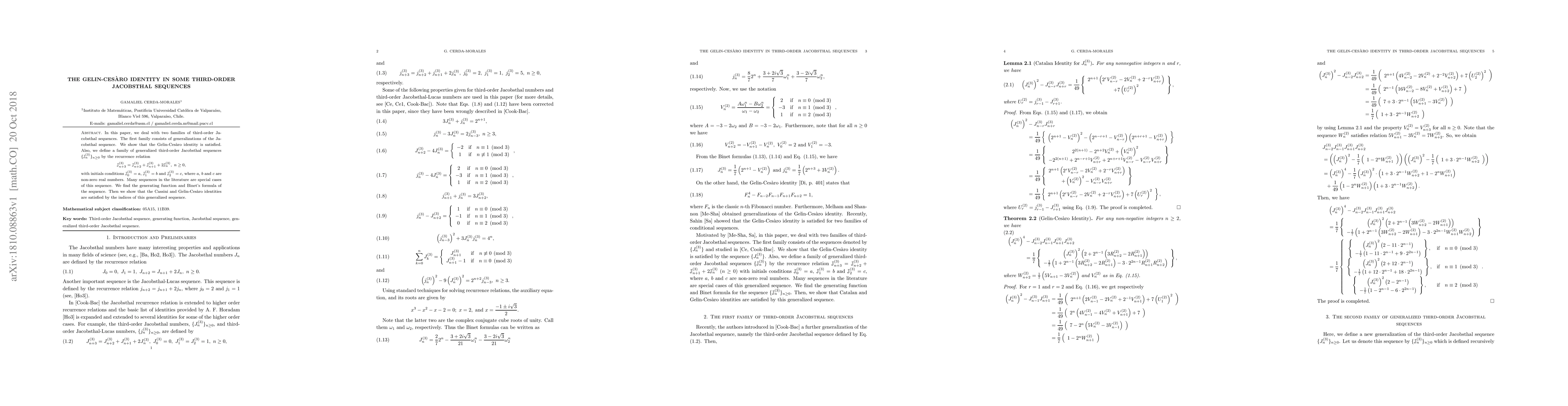 This paper explores two families of third-order Jacobsthal sequences, proving the satisfaction of the Gelin-Cesàro identity in the first family. It introduces a generalized third-order Jacobsthal sequence defined by a specific recurrence relation and demonstrates the validity of the Cassini and Gelin-Cesàro identities for this sequence.