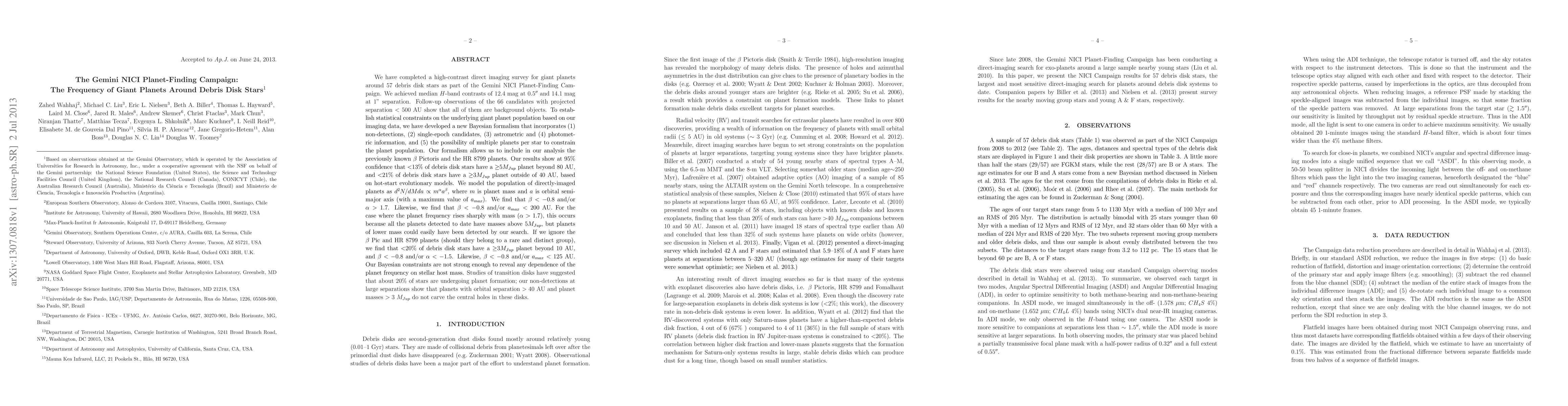 We have completed a high-contrast direct imaging survey for giant planets around 57 debris disk stars as part of the Gemini NICI Planet-Finding Campaign. We achieved median H-band contrasts of 12.4 mag at 0.5" and 14.1 mag at 1" separation. Follow-up observations of the 66 candidates with projected separation < 500 AU show that all of them are background objects. To establish statistical constraints on the underlying giant planet population based on our imaging data, we have developed a new Bayesian formalism that incorporates (1) non-detections, (2) single-epoch candidates, (3) astrometric and (4) photometric information, and (5) the possibility of multiple planets per star to constrain the planet population. Our formalism allows us to include in our analysis the previously known Beta Pictoris and the HR 8799 planets. Our results show at 95% confidence that <13% of debris disk stars have a >5MJup planet beyond 80 AU, and <21% of debris disk stars have a >3MJup planet outside of 40 AU, based on hot-start evolutionary models. We model the population of directly-imaged planets as d^2N/dMda ~ m^alpha a^beta, where m is planet mass and a is orbital semi-major axis (with a maximum value of amax). We find that beta < -0.8 and/or alpha > 1.7. Likewise, we find that beta < -0.8 and/or amax < 200 AU. If we ignore the Beta Pic and HR 8799 planets (should they belong to a rare and distinct group), we find that < 20% of debris disk stars have a > 3MJup planet beyond 10 AU, and beta < -0.8 and/or alpha < -1.5. Our Bayesian constraints are not strong enough to reveal any dependence of the planet frequency on stellar host mass. Studies of transition disks have suggested that about 20% of stars are undergoing planet formation; our non-detections at large separations show that planets with orbital separation > 40 AU and planet masses > 3 MJup do not carve the central holes in these disks.